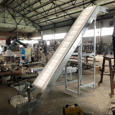 1、它可以与包装,色选机,振动筛等设备配套使用来完成产品的分级和包装。裙边波状挡边皮带输送机是-种可大倾角输送甚至垂直提升散料的特种皮带式输送机。它的结构与通用皮带输送机基本相似,主要区别是采用了特制的裙边波状挡边输送带。波状挡边输送带是在通用的输送带两侧粘上不同高度的可弯曲、可伸缩的S形或W形波状挡边,同时在两条挡边之间的基带上依一定间距粘上横隔板,以便装运物料。输送线路通常布置成Z形、L形、或直线形。这种输送机可以实现大倾角输送,从而可减少占地。它与斗式提升机相比,输送能力大,能耗小,便于维修。