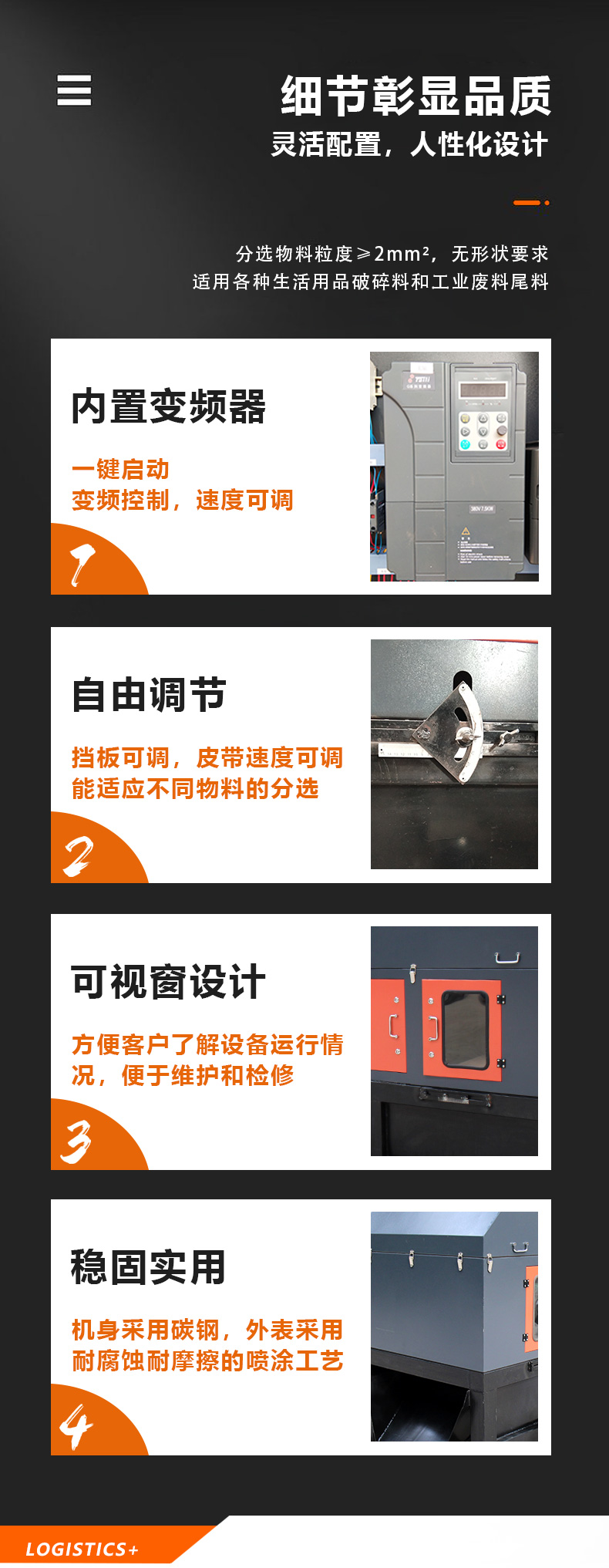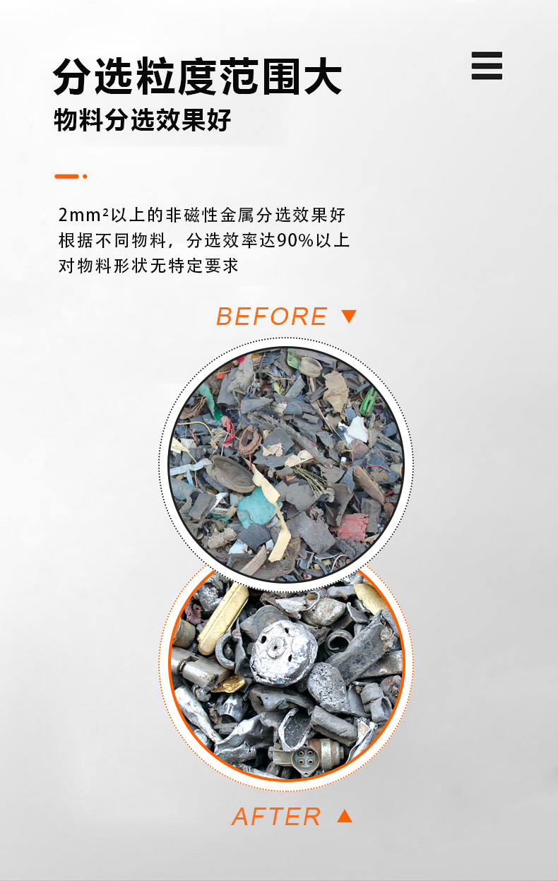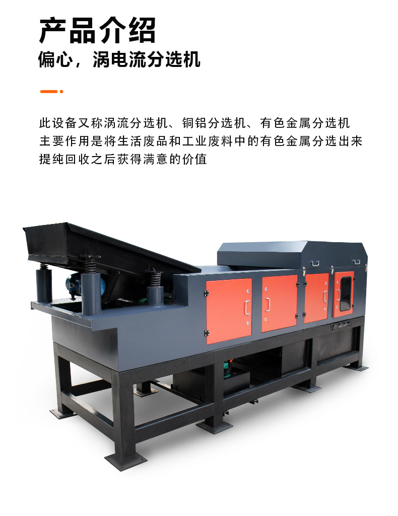 涡电流分选机又称为涡流分选机、有色金属分选机、铜铝分选机等,主要用于工业和生活废料中回收有色金属,分选粒度范围≥2平方毫米的有色金属。处理对象有:废铜(铝)电力电缆、铝制品、汽车废料、非铁金属碎片、电路板破碎料、含非铁金属玻璃潭、电子废品、多金属(铜、铝、锌)混合物、垃圾燃烧后的金属渣、塑料和金属混合物料等。