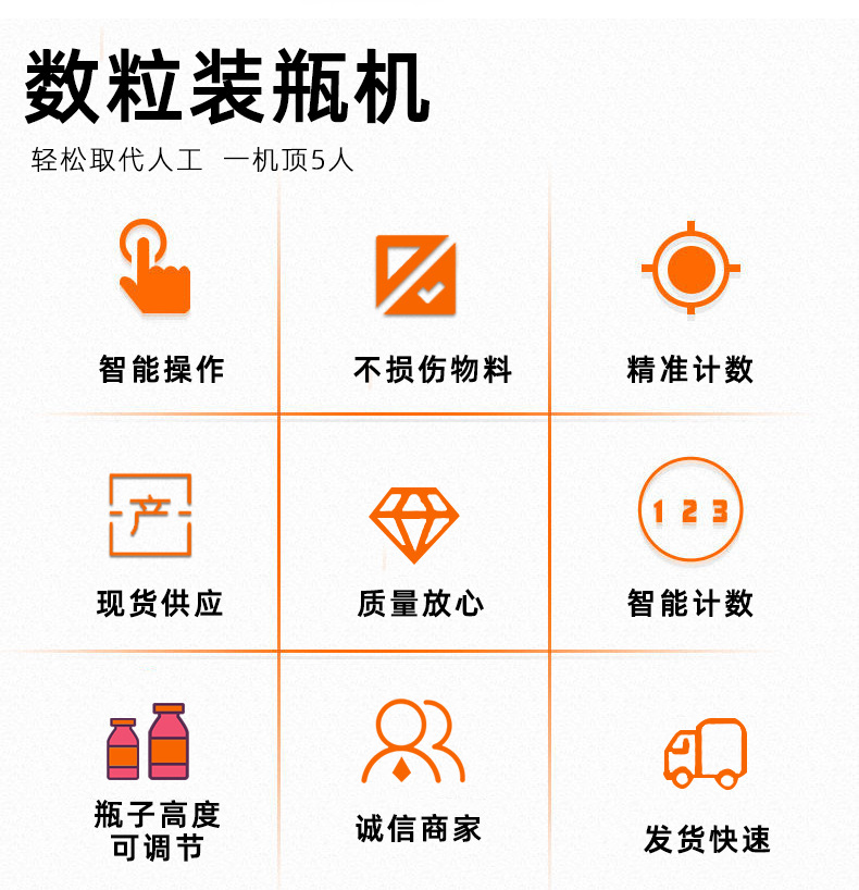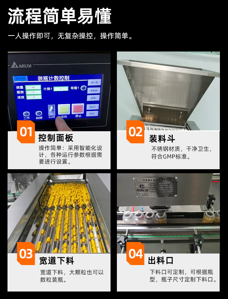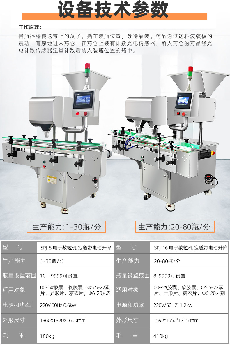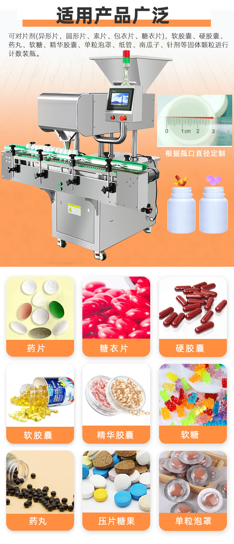 1.兼容性强,可以对片剂(包括异型片)、胶囊、软胶囊(透明、不透明)、丸剂等固体制剂或固体颗粒进行计数装瓶;
