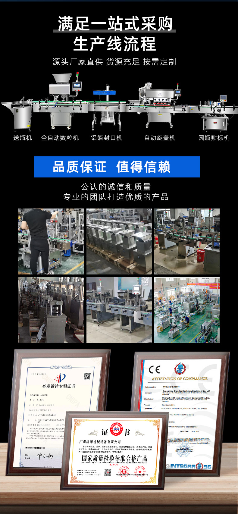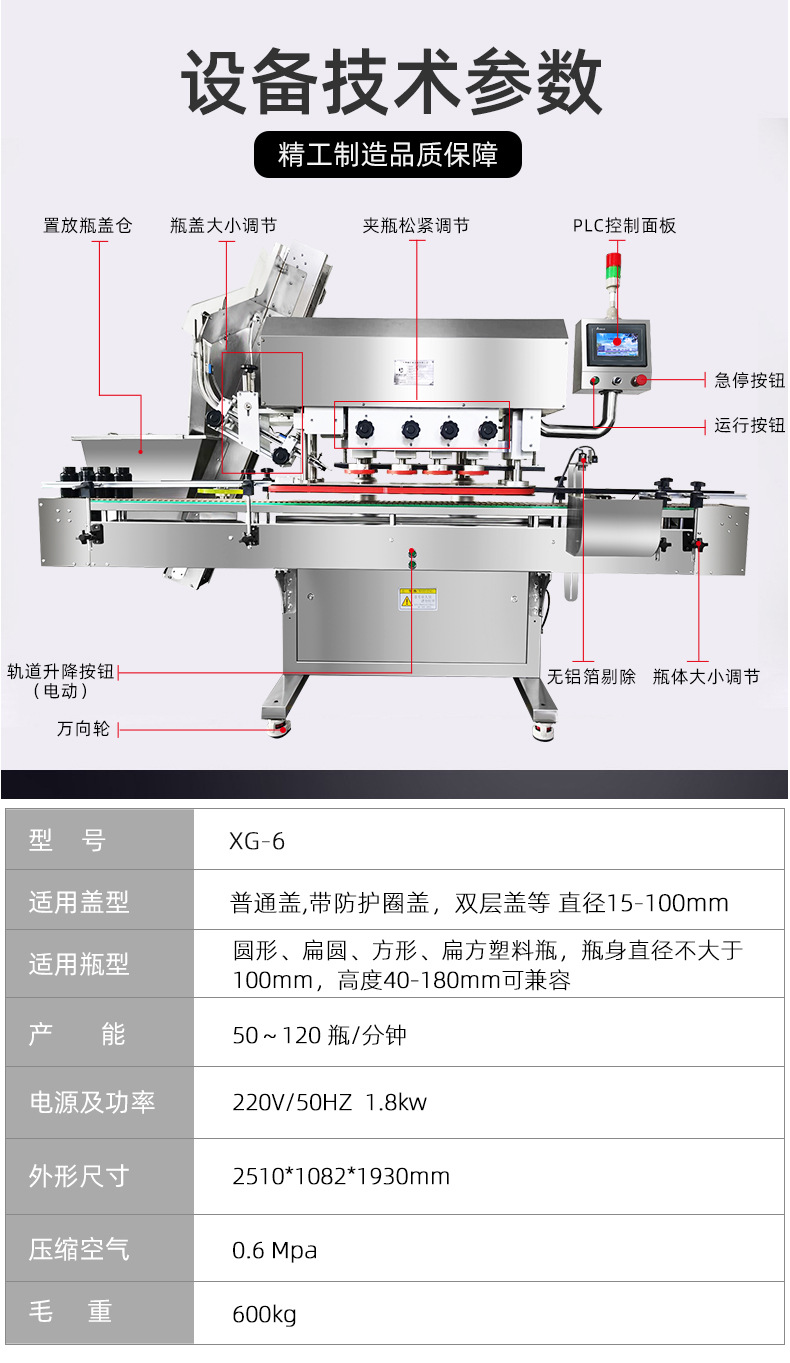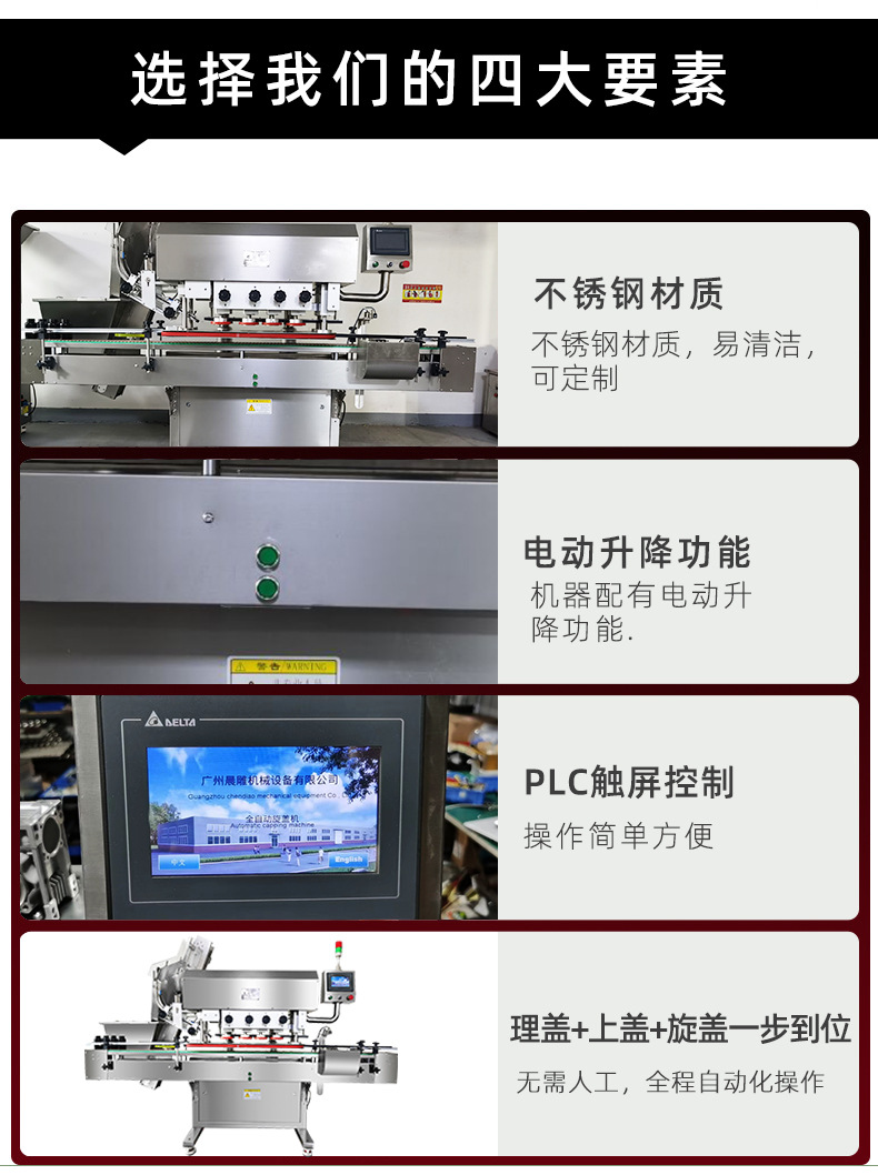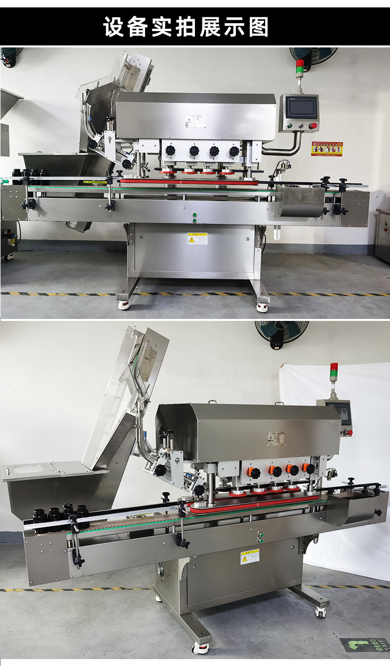 2. 自动理盖、上盖、旋盖一体,适用各种规格的瓶盖。