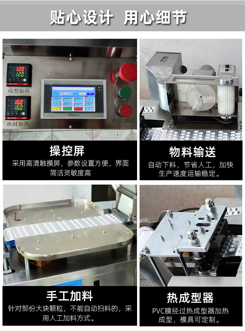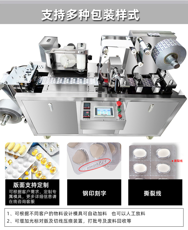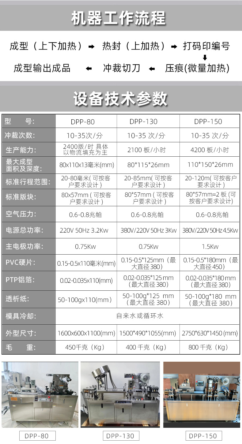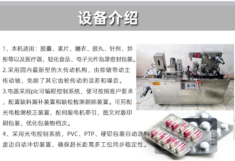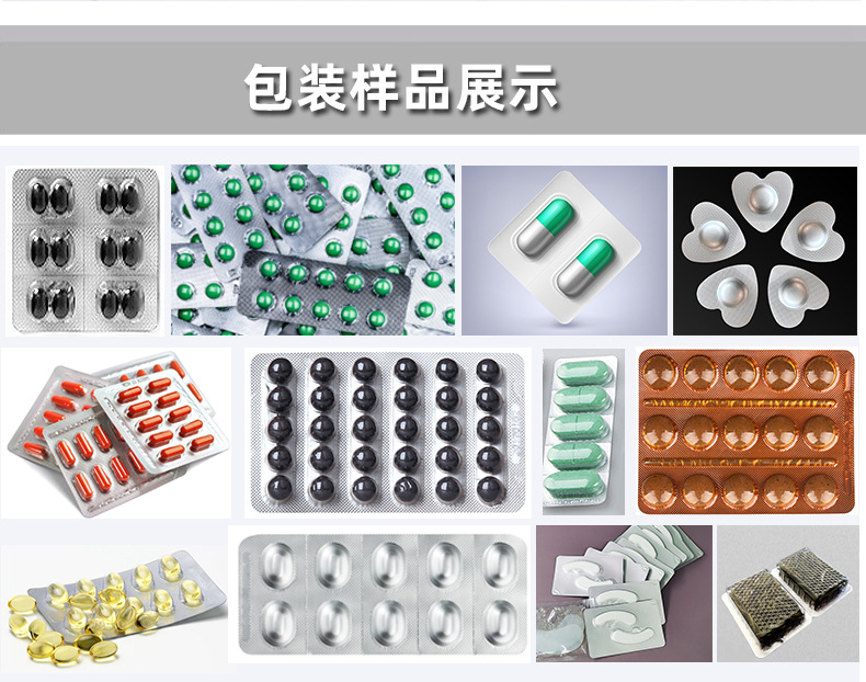 6、本机适用:胶囊、素片、糖衣、胶丸、针剂、异形等以及医疗器、轻化食品、电子元件泡罩密封包装。
