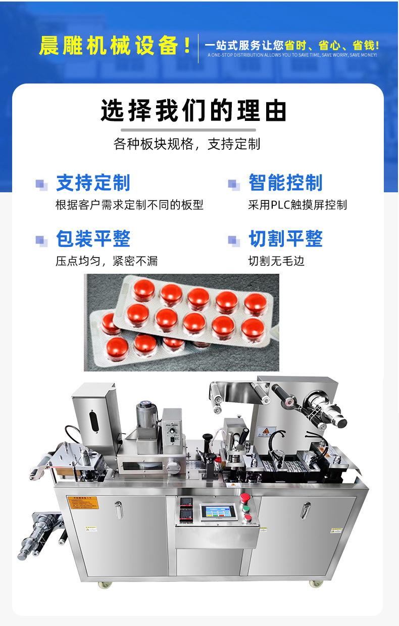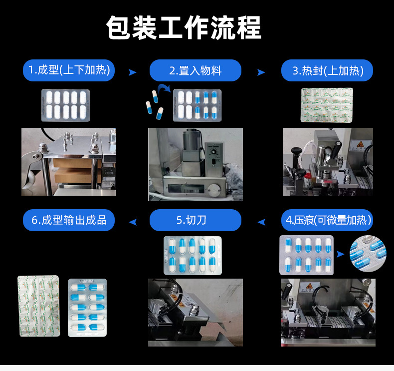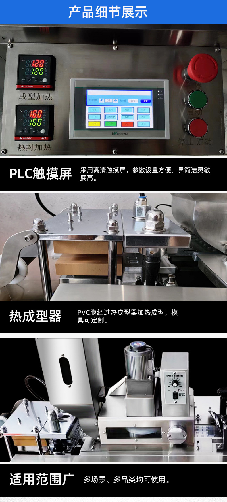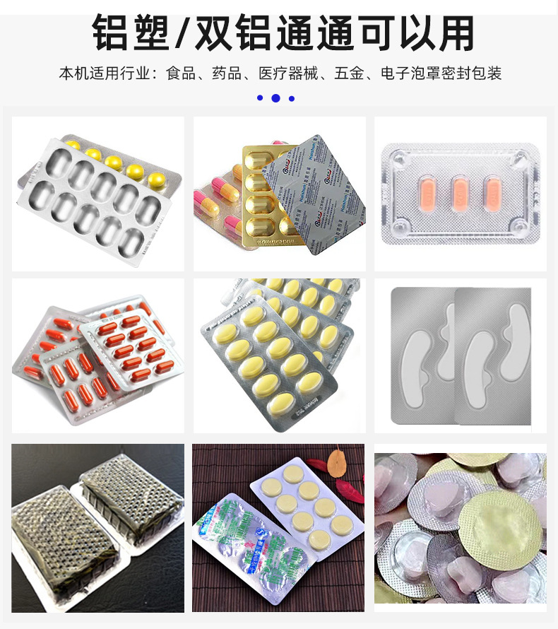 6、本机适用:胶囊、素片、糖衣、胶丸、针剂、异形等以及医疗器、轻化食品、电子元件泡罩密封包装。