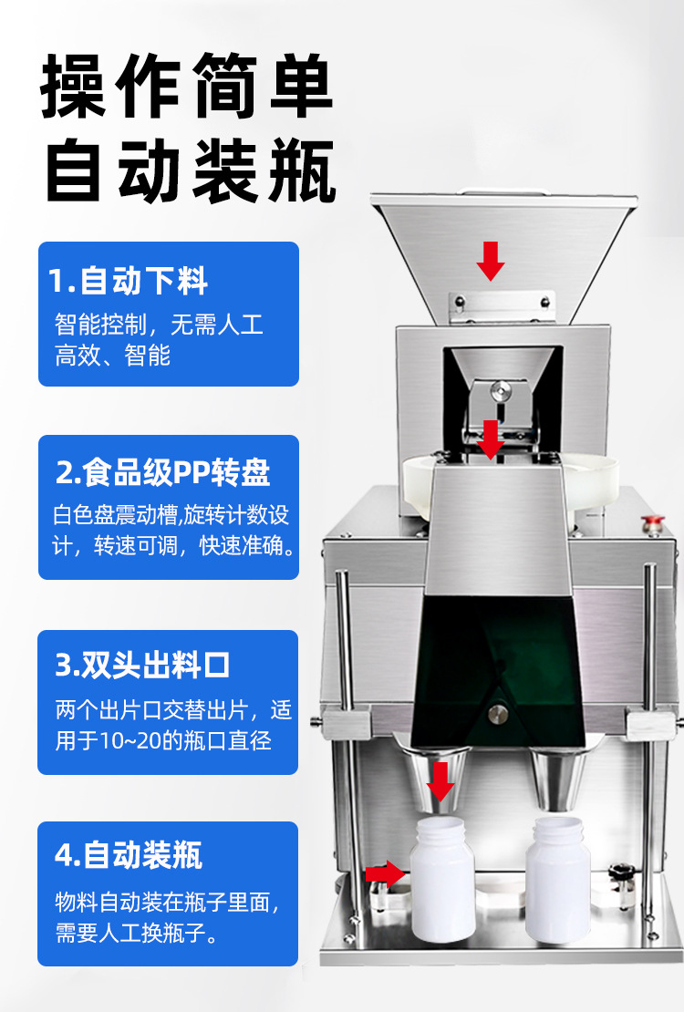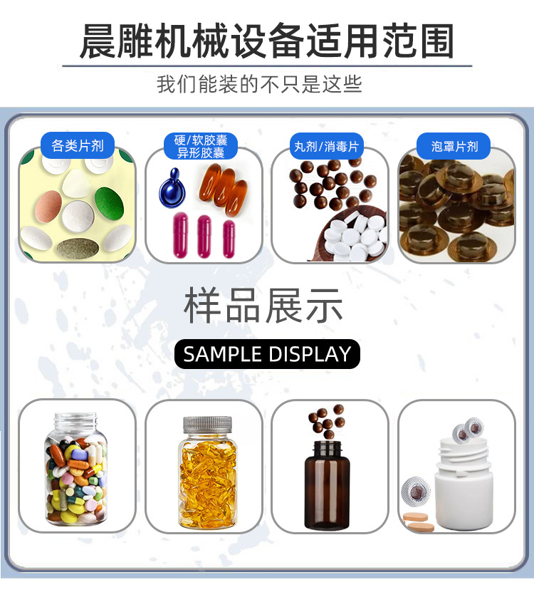 适用于制药、食品、保健品、医院等行业准确、快速灌装小批量的片剂,胶囊,丸剂,糖果等。