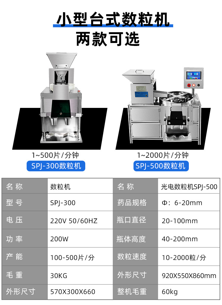 SPJ-300台式电子数粒灌装一体机,采用振动下料,彩色触摸屏人机界面,振动下料和光纤系统计数功能,智能控制,是集光纤传感一体化的台式自动计数灌装设备。可设置灌装粒数瓶数,具有体积小、重量轻、安装方便、操作简单、计数灌装快速准确等特点。