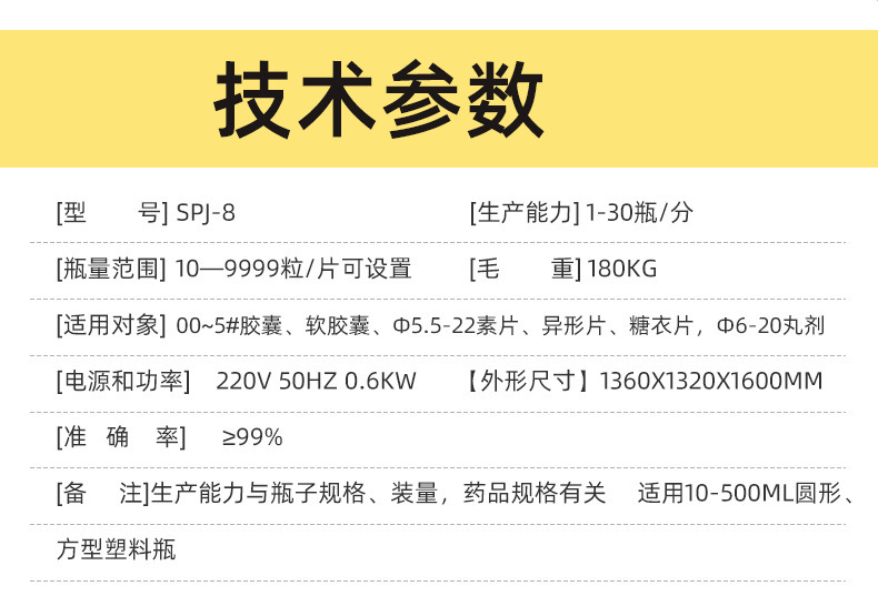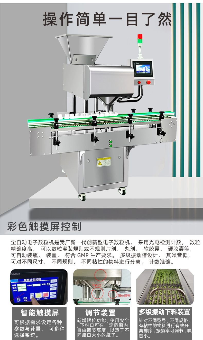 主要产品包括:电子数粒机、给袋式数粒包装机,瓶装生产线、全自动旋盖机,干燥剂塞入机,全自动理瓶机 压片机等整套制药设备。以过硬的产品质量、诚实守信的品格赢得了客户的尊重和信任。