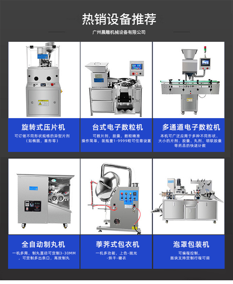 主要产品包括:电子数粒机、给袋式数粒包装机,瓶装生产线、全自动旋盖机,干燥剂塞入机,全自动理瓶机 压片机等整套制药设备。以过硬的产品质量、诚实守信的品格赢得了客户的尊重和信任。