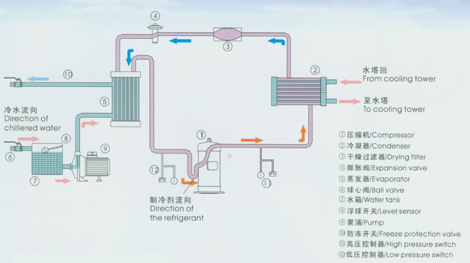 冷水机组具有下列部件以防止任何运转故障:压缩机保护设计时器、过电流继电器、压缩机电机温感器、防冻结温控器、视液镜、油加热器、压缩机逆相保护继电器、高,低压保护,排气高温保护,安全阀,易溶塞.