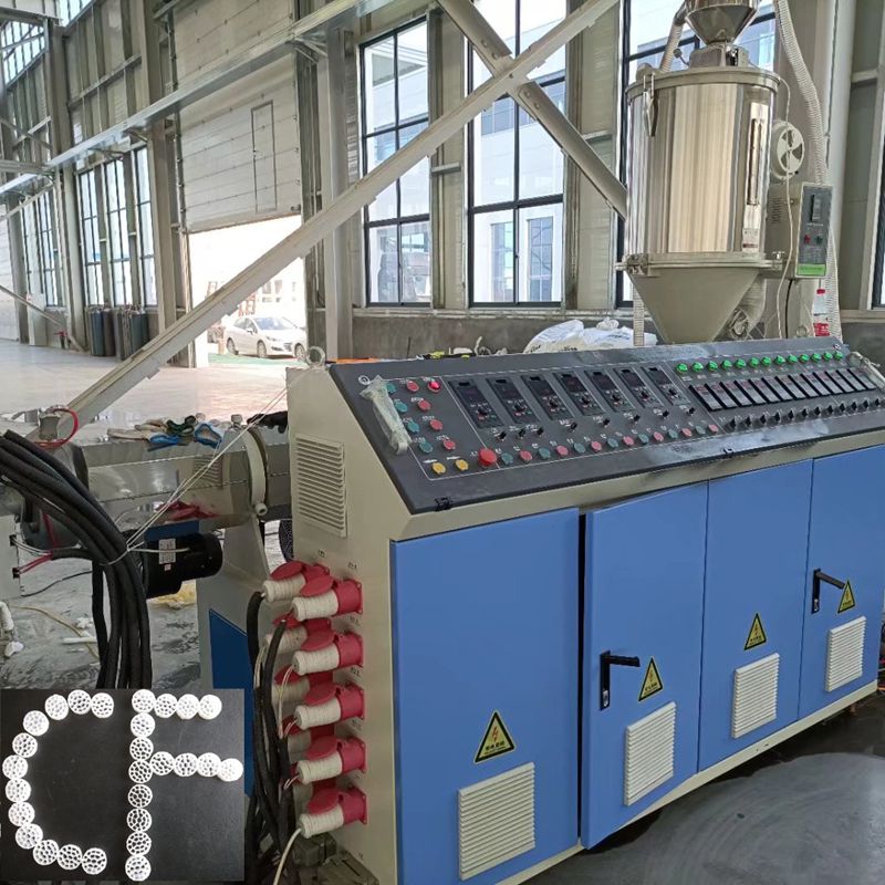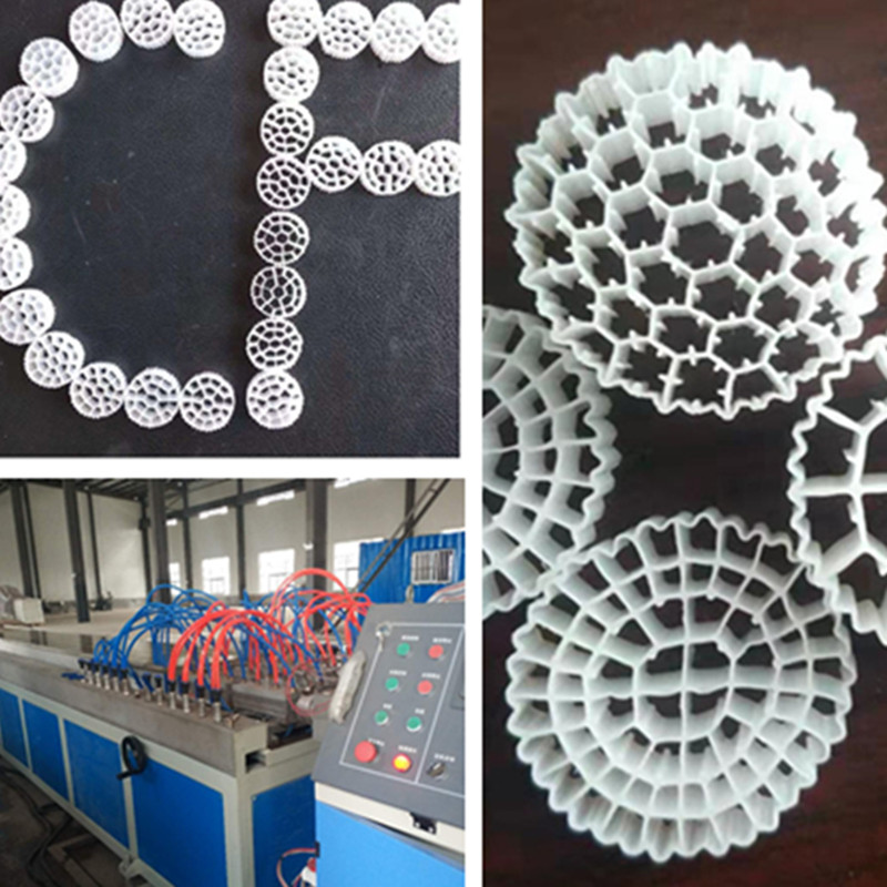 PE生物填料管挤出生产线由塑料挤出主机,成型模具,真空定型水箱,皮带式牵引机,自动切割机,电气控制柜组成。