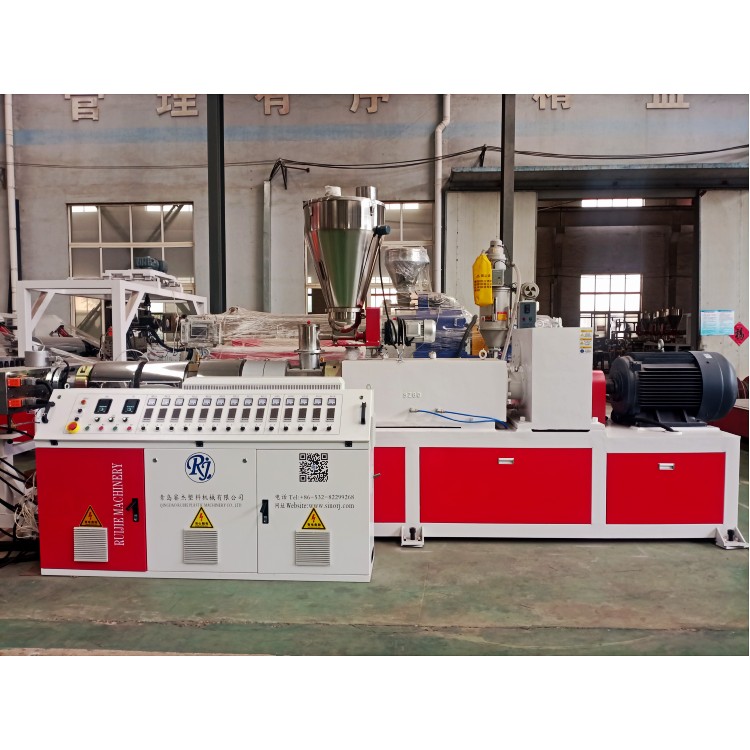 双螺杆80挤出机、定型平台、八辊牵引机、横向切割机、落料架组成。这里说的组成是指纯生产线,此外还需要配置挤出板模具、水冷却定型模具、混料机、破碎机、磨粉机才能完成完整的生产过程。