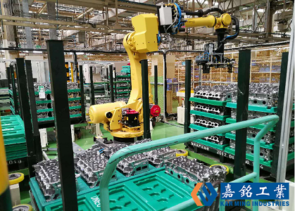 随着工业自动化的快速发展,人力成本持续增加,采用人工进行发动机零部件的上下料,其搬运效率低,生产成本高,而且人工上下料不能配合自动化加工的节拍要求,容易出现安全事故。因此,嘉铭科技根据发动机缸盖上下料需要,结合嘉铭公司自主研发的3D视觉引导上下料系统,开发出3D视觉引导上下料生产线,与AGV无人车配合使用,无需人工操作,按照生产任务规划,自动完成生产任务。