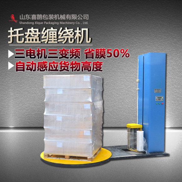 山东喜鹊托盘缠绕机包装高度可根据客户要求定做!同时根据包装的实际需要,可选用膜架固定与膜架上下移动两款设备。广泛应用于玻璃制品、五金工具、电子电器、造纸、陶瓷、化工、食品、饮料、建材等行业。山东喜鹊托盘缠绕机能够提高包装效率、减少运输过程中的损耗,具有防尘、防潮、降低包装成本等优点,山东喜鹊托盘缠绕机是集约化包装的理想选择。缠绕包装机主要应用于化工、电子、耐材、玻璃制品、造纸、五金、食品饮料等行业,