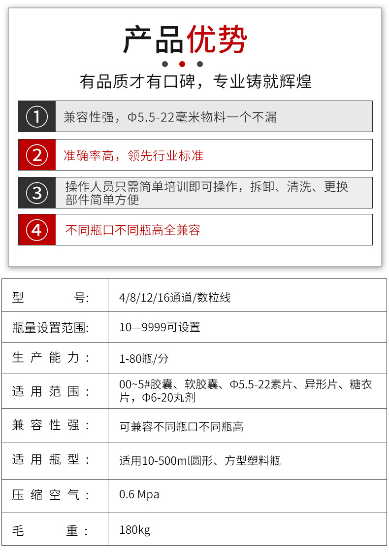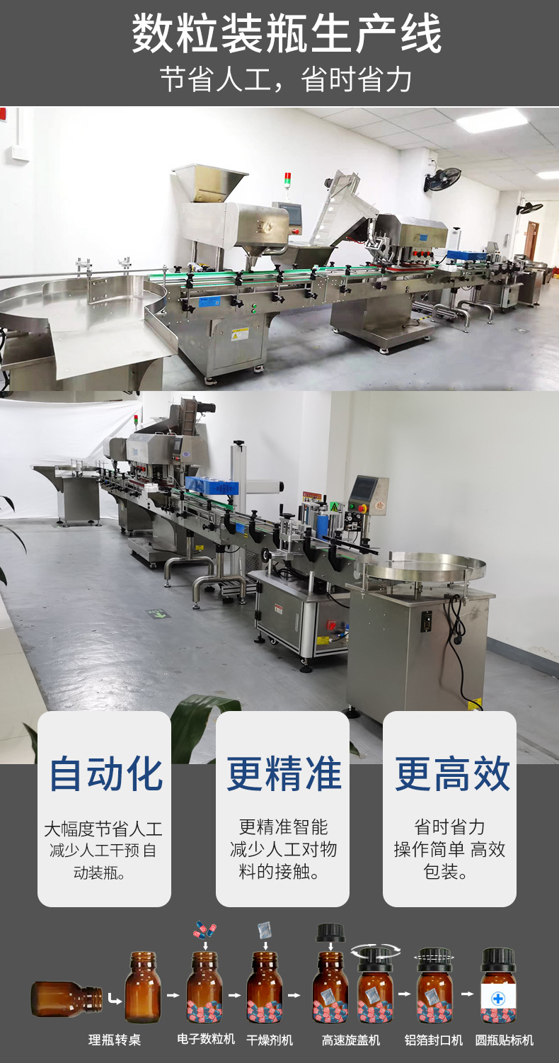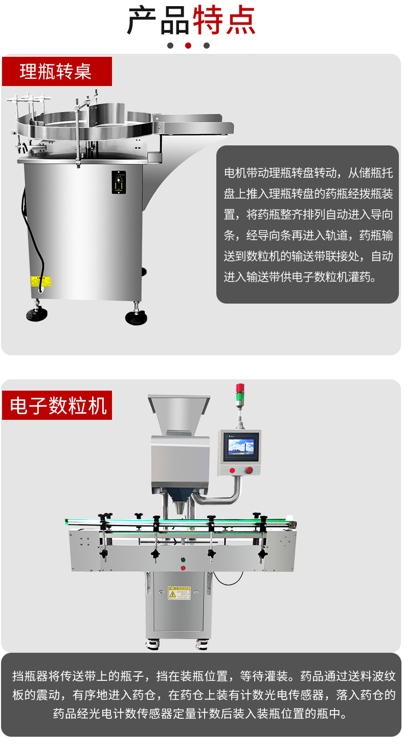 兼容性强,可以对片剂(包括异型片)、胶囊、软胶囊(透明、不透明)、丸剂等固体制剂或固体颗粒进行计数装瓶;