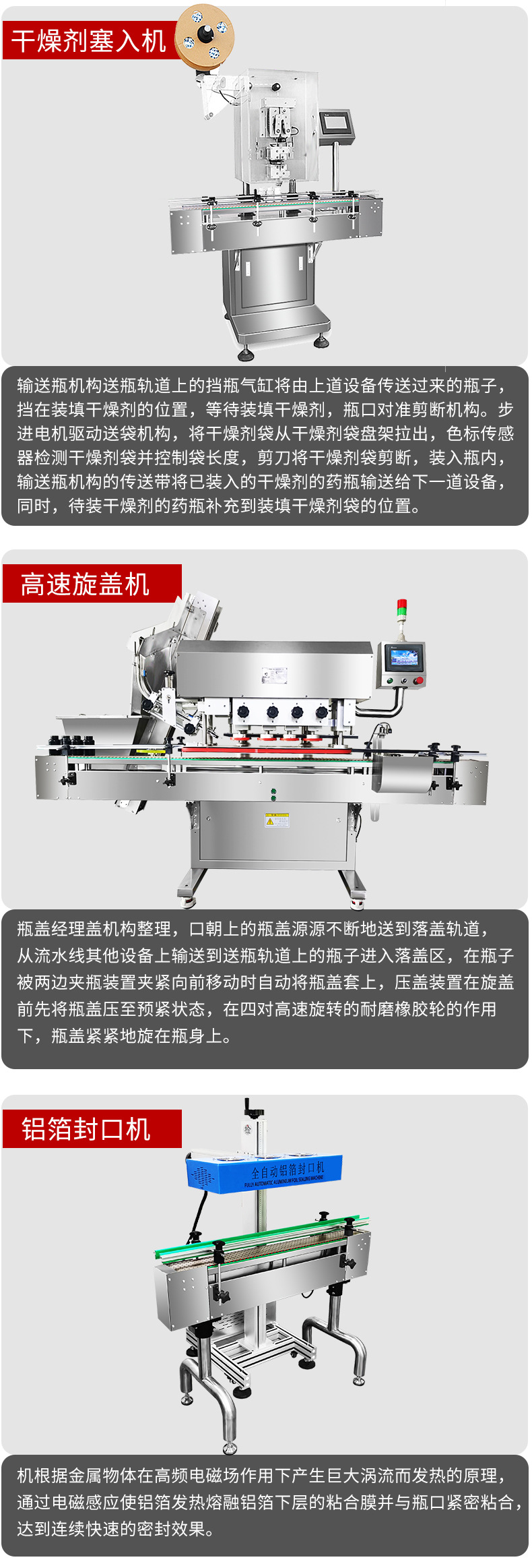 主要产品包括:电子数粒机、给袋式数粒包装机,瓶装生产线、全自动旋盖机,干燥剂塞入机,全自动理瓶机 压片机等整套制药设备。以过硬的产品质量、诚实守信的品格赢得了客户的尊重和信任。