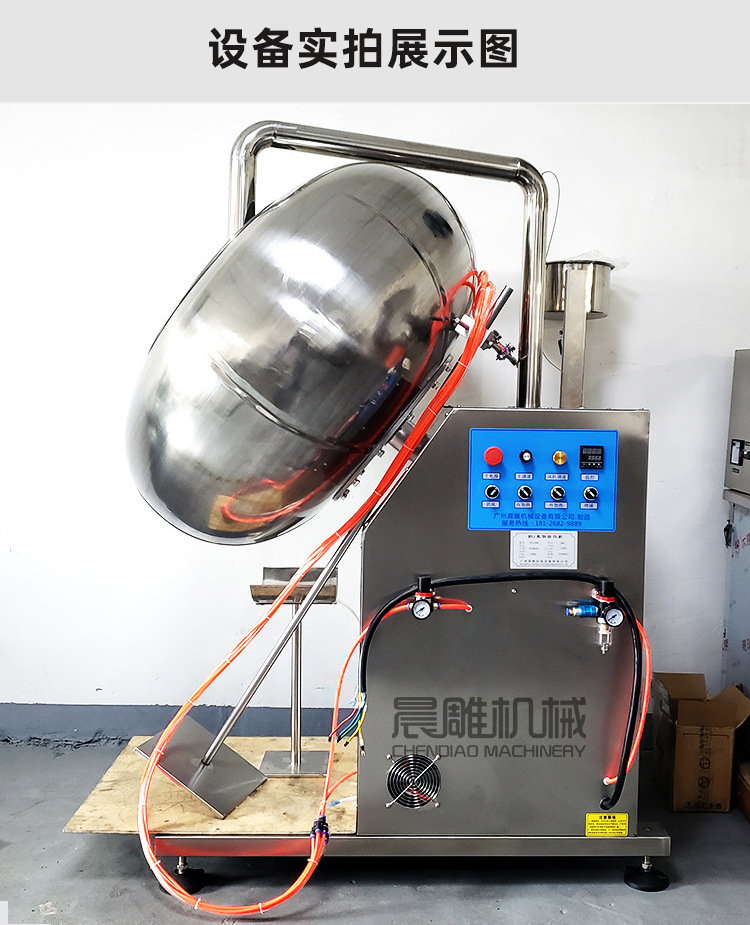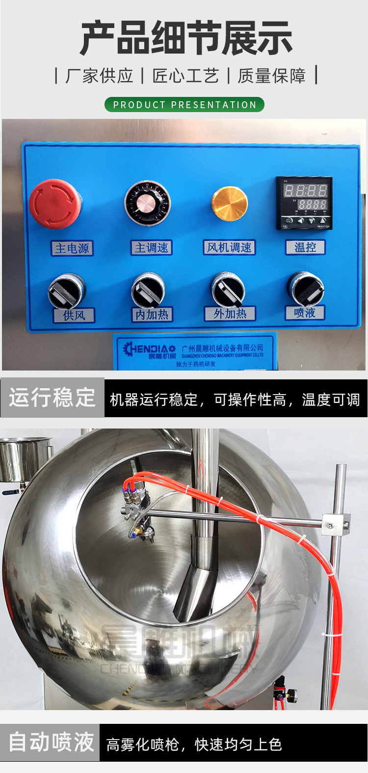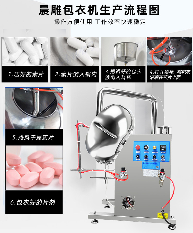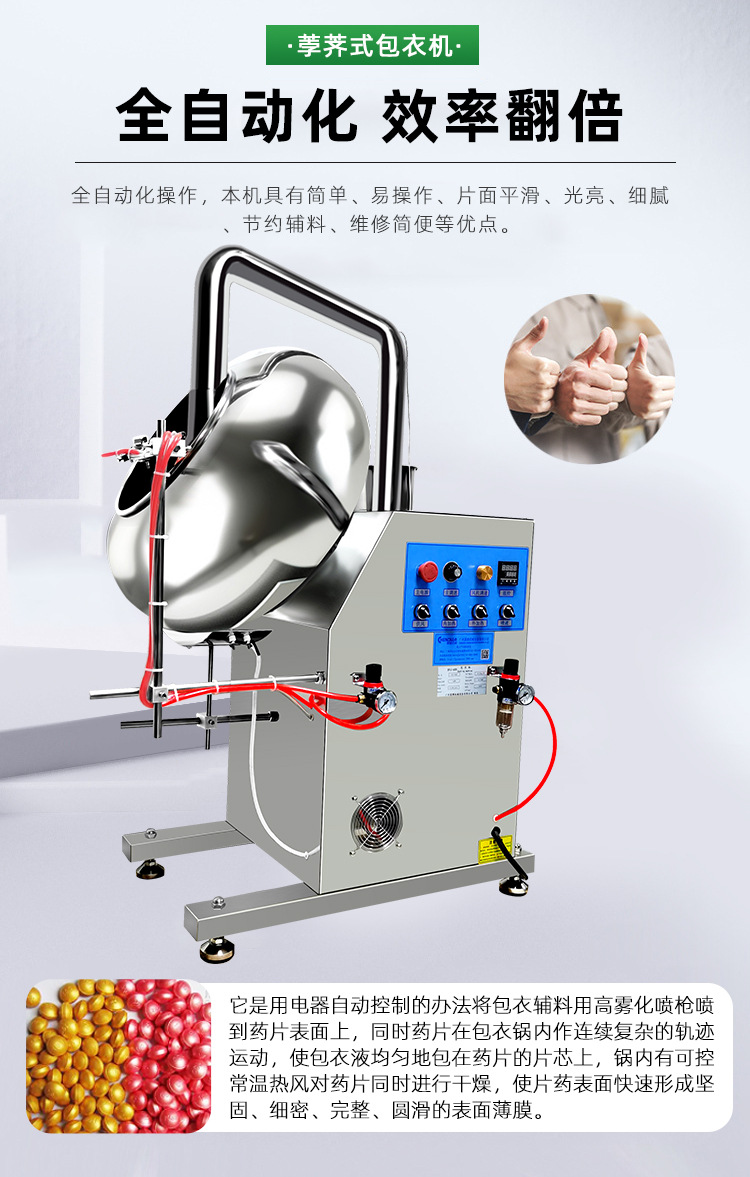 本机是对中、西药片片芯外表进行糖衣、薄膜等包衣的设备,是集强电、弱电、液压、气动于一体化,将原普通型糖衣机改造的新型设备。主要由主机(原糖衣机)、可控常温热风系统、自动供液供气的喷雾系统等部分组成。主电机可变频调速,它是用电器自动控制的办法将包衣辅料用高雾化喷枪喷到药片表面上,同时药片在包衣锅内作连续复杂的轨迹运动,使包衣液均匀地包在药片的片芯上,锅内有可控常温热风对药片同时进行干燥,使片药表面快速形成坚固、细密、完整、圆滑的表面薄膜。