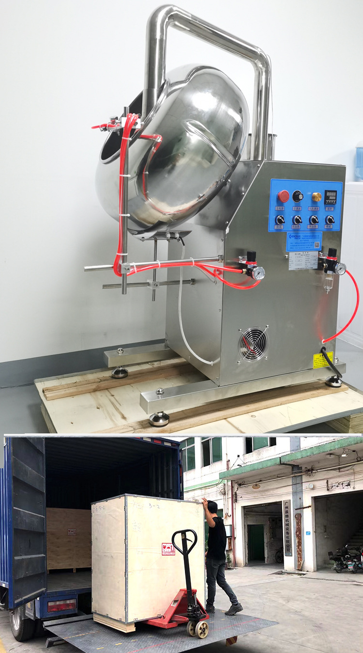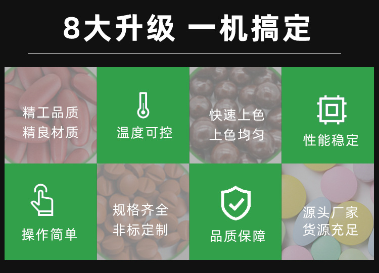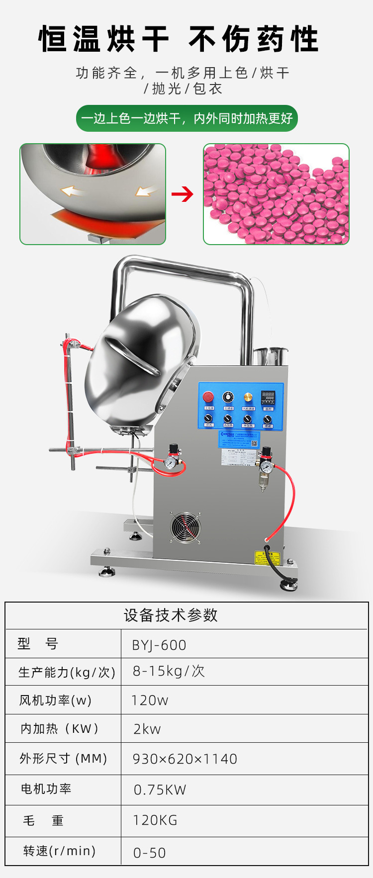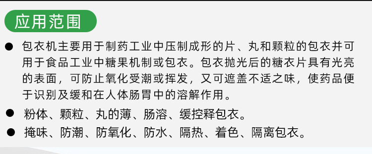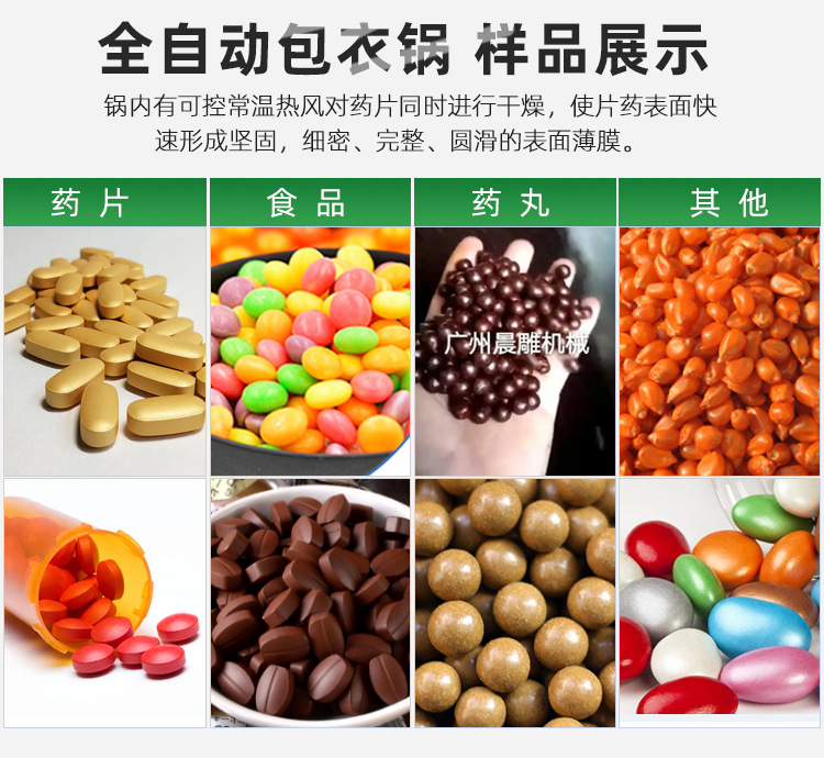 本机是对中、西药片片芯外表进行糖衣、薄膜等包衣的设备,是集强电、弱电、液压、气动于一体化,将原普通型糖衣机改造的新型设备。主要由主机(原糖衣机)、可控常温热风系统、自动供液供气的喷雾系统等部分组成。主电机可变频调速,它是用电器自动控制的办法将包衣辅料用高雾化喷枪喷到药片表面上,同时药片在包衣锅内作连续复杂的轨迹运动,使包衣液均匀地包在药片的片芯上,锅内有可控常温热风对药片同时进行干燥,使片药表面快速形成坚固、细密、完整、圆滑的表面薄膜。
