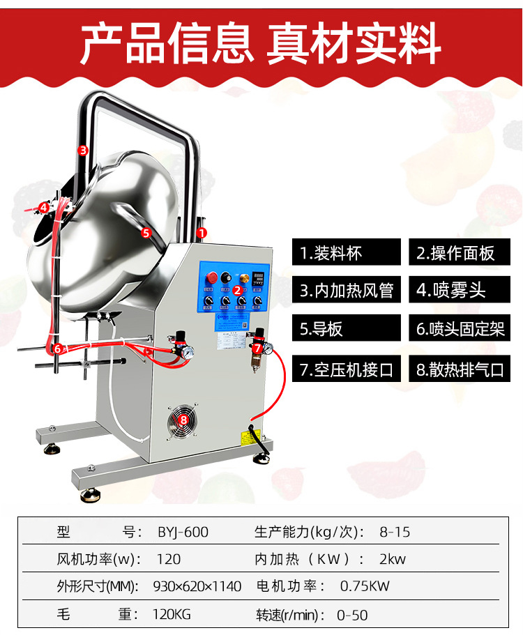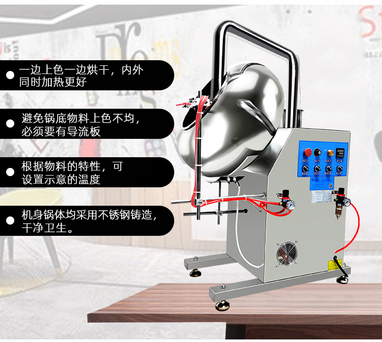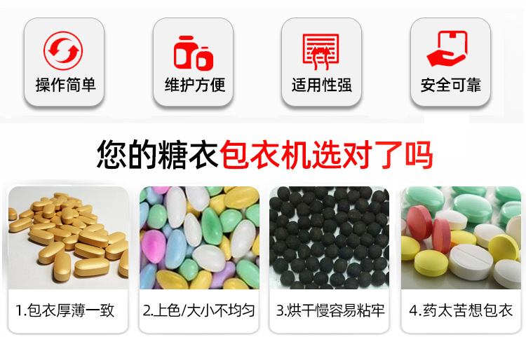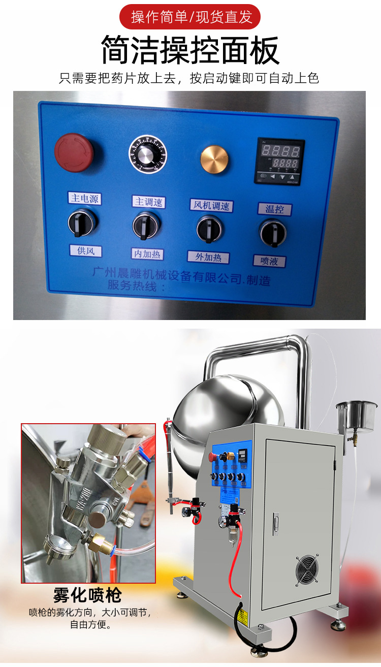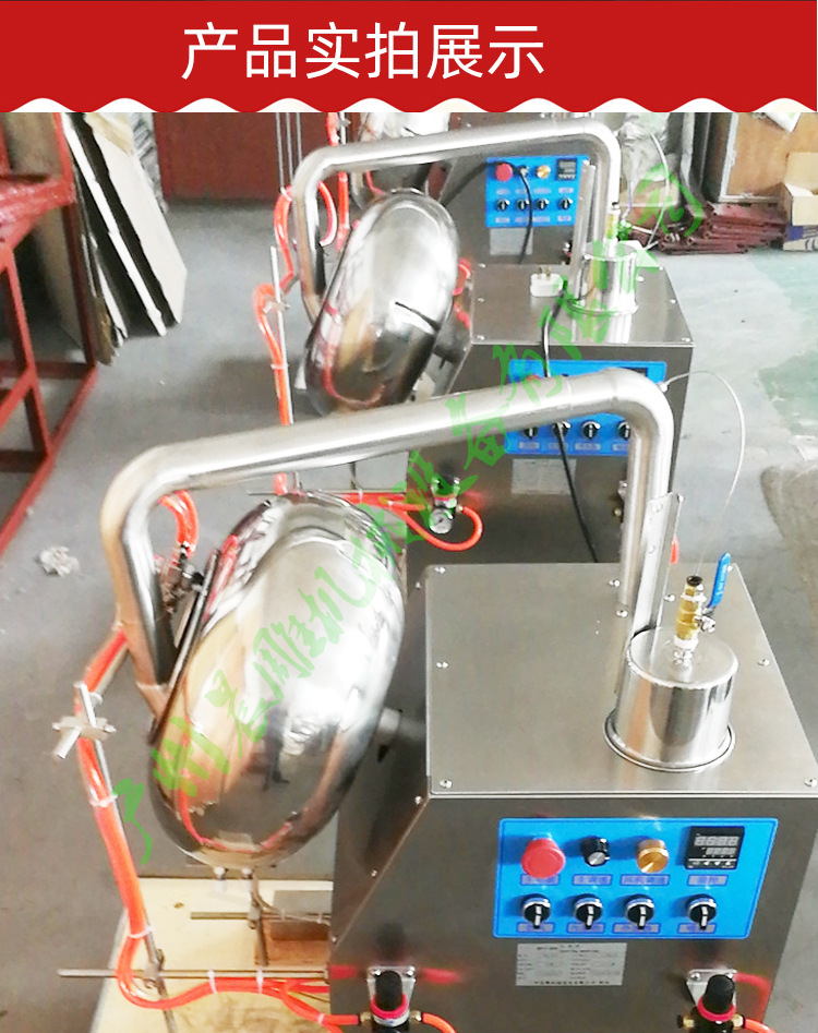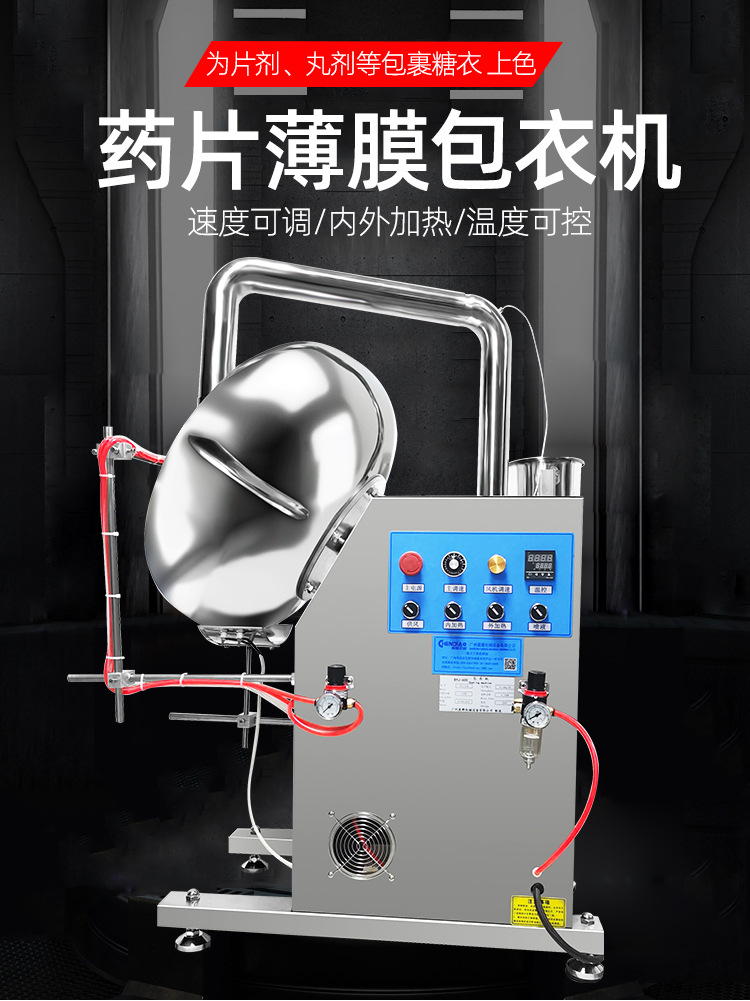 本机是对中、西药片片芯外表进行糖衣、薄膜等包衣的设备,是集强电、弱电、液压、气动于一体化,将原普通型糖衣机改造的新型设备。主要由主机(原糖衣机)、可控常温热风系统、自动供液供气的喷雾系统等部分组成。主电机可变频调速,它是用电器自动控制的办法将包衣辅料用高雾化喷枪喷到药片表面上,同时药片在包衣锅内作连续复杂的轨迹运动,使包衣液均匀地包在药片的片芯上,锅内有可控常温热风对药片同时进行干燥,使片药表面快速形成坚固、细密、完整、圆滑的表面薄膜。