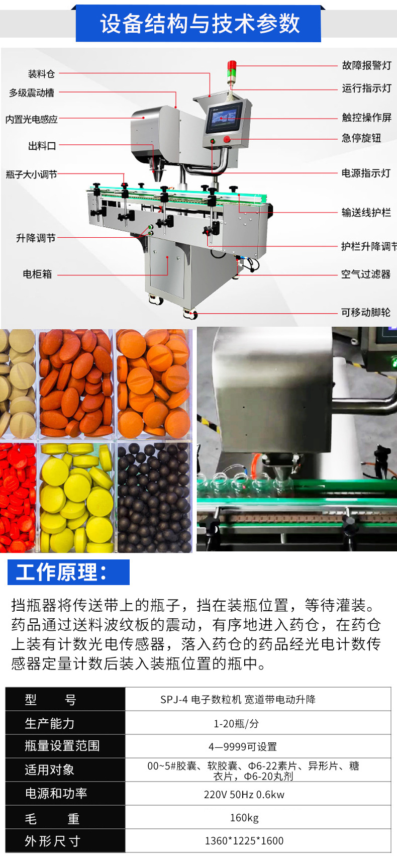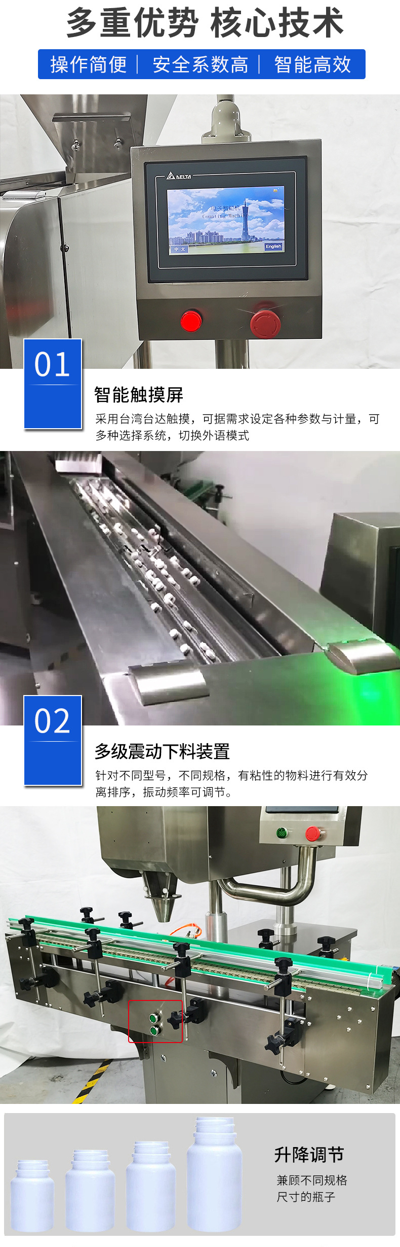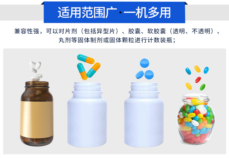 1.兼容性强,可以对片剂(包括异型片)、胶囊、软胶囊(透明、不透明)、丸剂等固体制剂或固体颗粒进行计数装瓶;