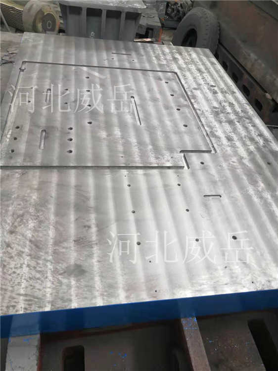 T型槽铸铁平台,外观基本上是箱体式,工作面有长方形、正方形、圆形等,材料为HT200-300,QT400-600,采用刮研工艺,工作面上可加工V形、T形、U形槽、燕尾槽、圆孔、长孔等,是用于工件、设备检测、划线、装配、焊接、组装、铆焊的平面基准量具。