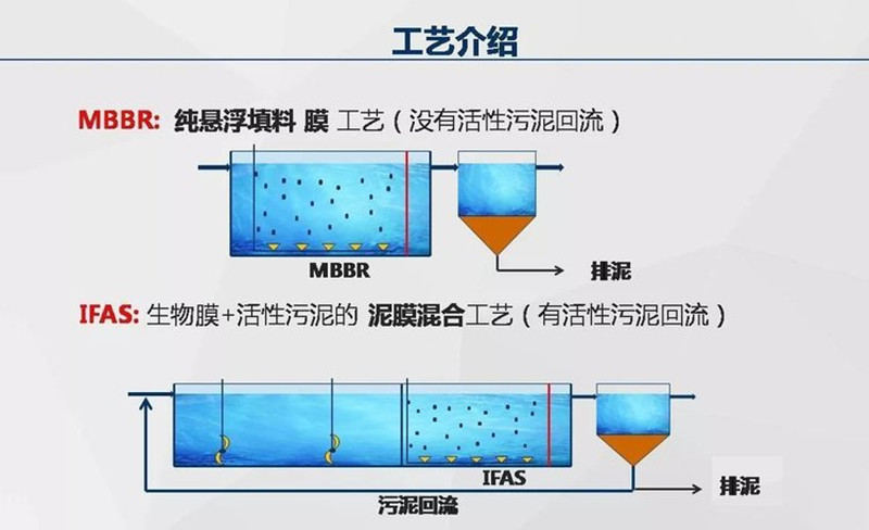MBBR工艺兼具传统流化床和生物接触氧化法两者的优点,是一种新型高效的污水处理方法,依靠曝气池内的曝气和水流的提升作用使载体处于流化状态,进而形成悬浮生长的活性污泥和附着生长的生物膜,这就使得移动床生物膜使用了整个反应器空间,充分发挥附着相和悬浮相生物两者的优越性,使之扬长避短,相互补充。与以往的填料不同的是,悬浮填料能与污水频繁多次接触因而被称为"移动的生物膜"。