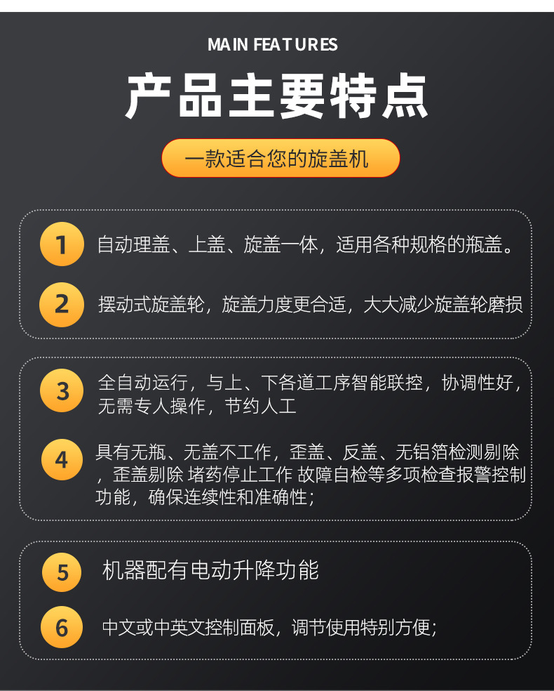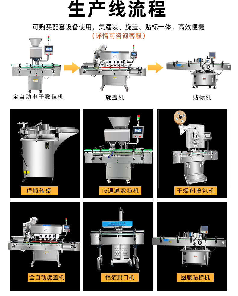 主要产品包括:电子数粒机、给袋式数粒包装机,瓶装生产线、全自动旋盖机,干燥剂塞入机,全自动理瓶机 压片机等整套制药设备。以过硬的产品质量、诚实守信的品格赢得了客户的尊重和信任。