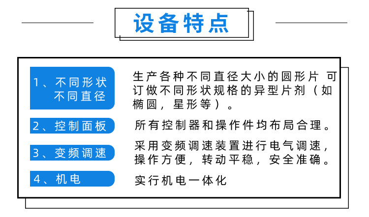 主要产品包括:电子数粒机、给袋式数粒包装机,瓶装生产线、全自动旋盖机,干燥剂塞入机,全自动理瓶机 压片机等整套制药设备。以过硬的产品质量、诚实守信的品格赢得了客户的尊重和信任。