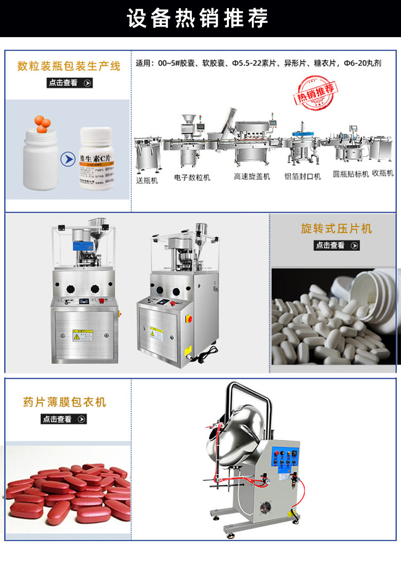 主要产品包括:电子数粒机、给袋式数粒包装机,瓶装生产线、全自动旋盖机,干燥剂塞入机,全自动理瓶机 压片机等整套制药设备。以过硬的产品质量、诚实守信的品格赢得了客户的尊重和信任。