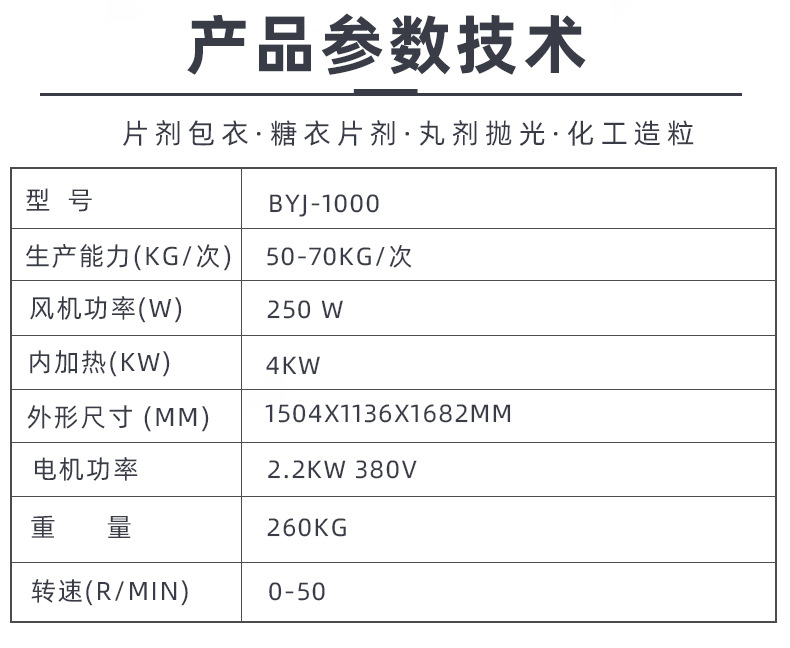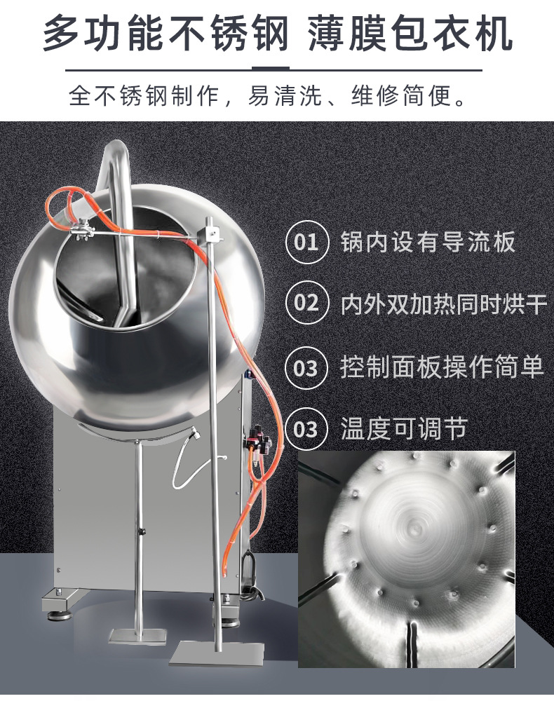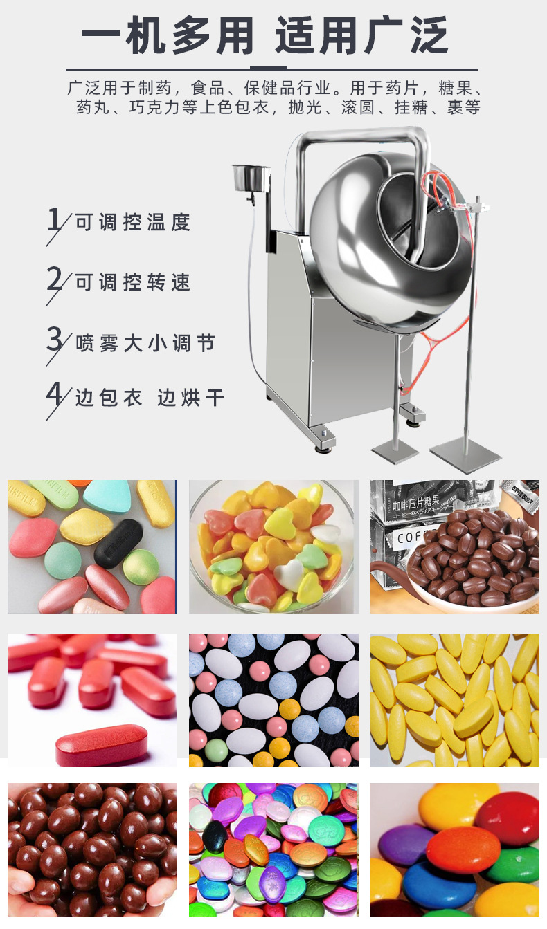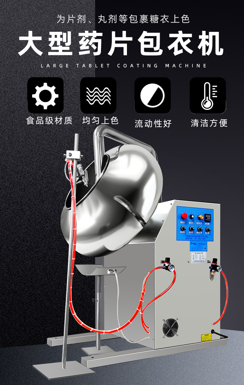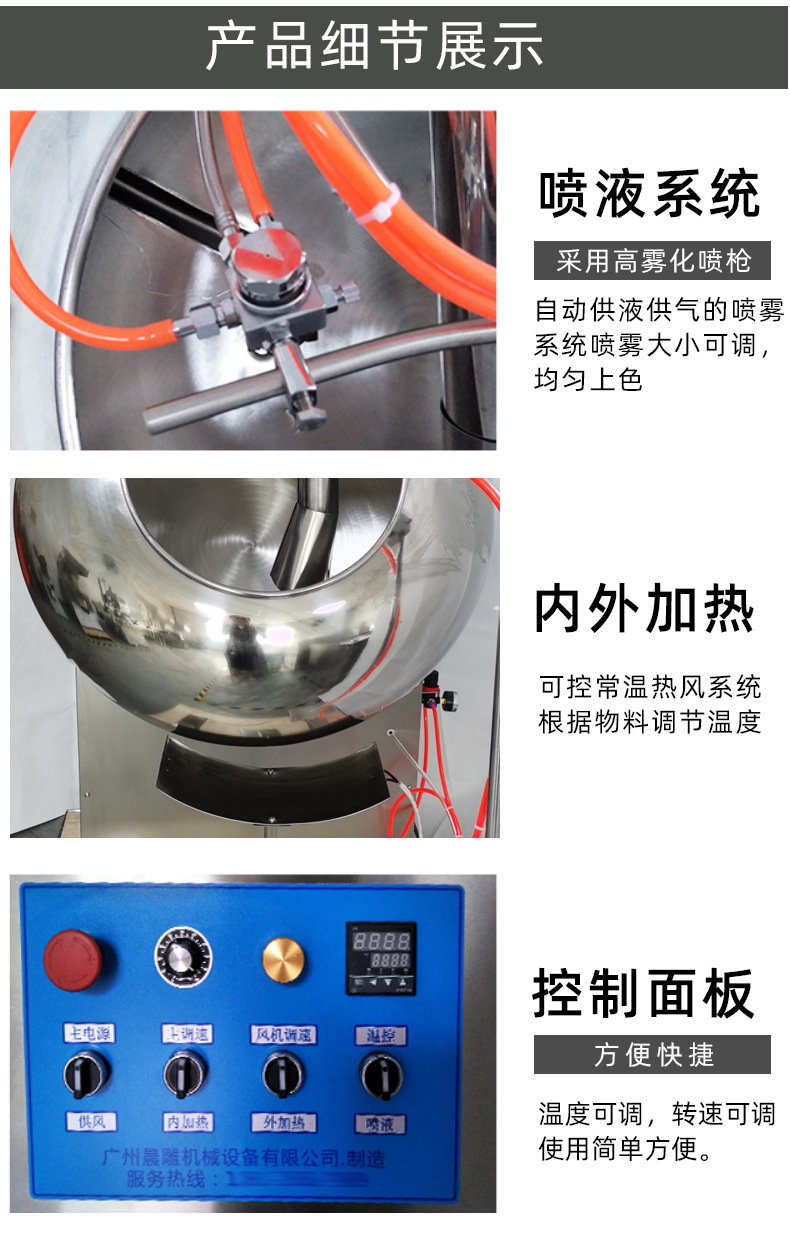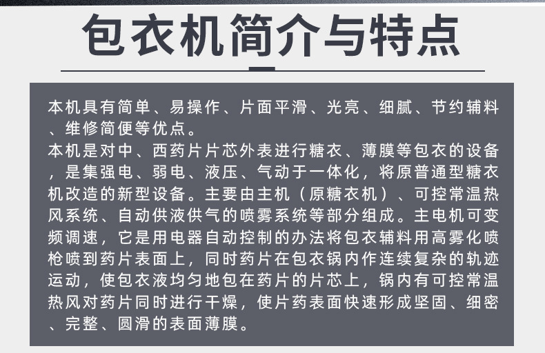 本机是对中、西药片片芯外表进行糖衣、薄膜等包衣的设备,是集强电、弱电、液压、气动于一体化,将原普通型糖衣机改造的新型设备。主要由主机(原糖衣机)、可控常温热风系统、自动供液供气的喷雾系统等部分组成。主电机可变频调速,它是用电器自动控制的办法将包衣辅料用高雾化喷枪喷到药片表面上,同时药片在包衣锅内作连续复杂的轨迹运动,使包衣液均匀地包在药片的片芯上,锅内有可控常温热风对药片同时进行干燥,使片药表面快速形成坚固、细密、完整、圆滑的表面薄膜。