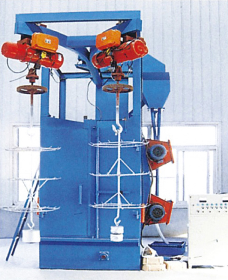 本机由单双吊钩承载工件进入清理室进行抛及清理,型号根据产品尺寸大小效率来定,室体采用全封面结构,特种耐磨合金铸钢护板,无弹丸飞溅现象,采用电动葫芦实现工件的上卸、升降和行走,工件在室体内设有正反自转机构,尤其适合怕碰撞产品,可选择自动和手动控制,可单机使用也可配线使用。