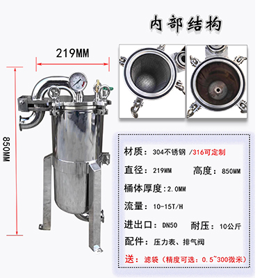 袋式过滤器一般采用不锈钢或碳钢材质焊接而成,可装单袋,双袋或多只滤袋,每只滤袋都由不锈钢网篮支撑,保证不会被物料冲破。过滤时,物料由侧面或顶上进入滤袋内,;滤后清液由侧面或底部出口流出,杂质则留在袋内,更换滤袋时取出处理。