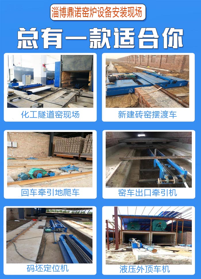 隧道窑运转设备主要是有摆渡车、回车牵引机、出口牵引机、液压顶车机、码坯定位机、卷扬机、地爬车构成,这些设备都是淄博鼎诺机械主导产品。