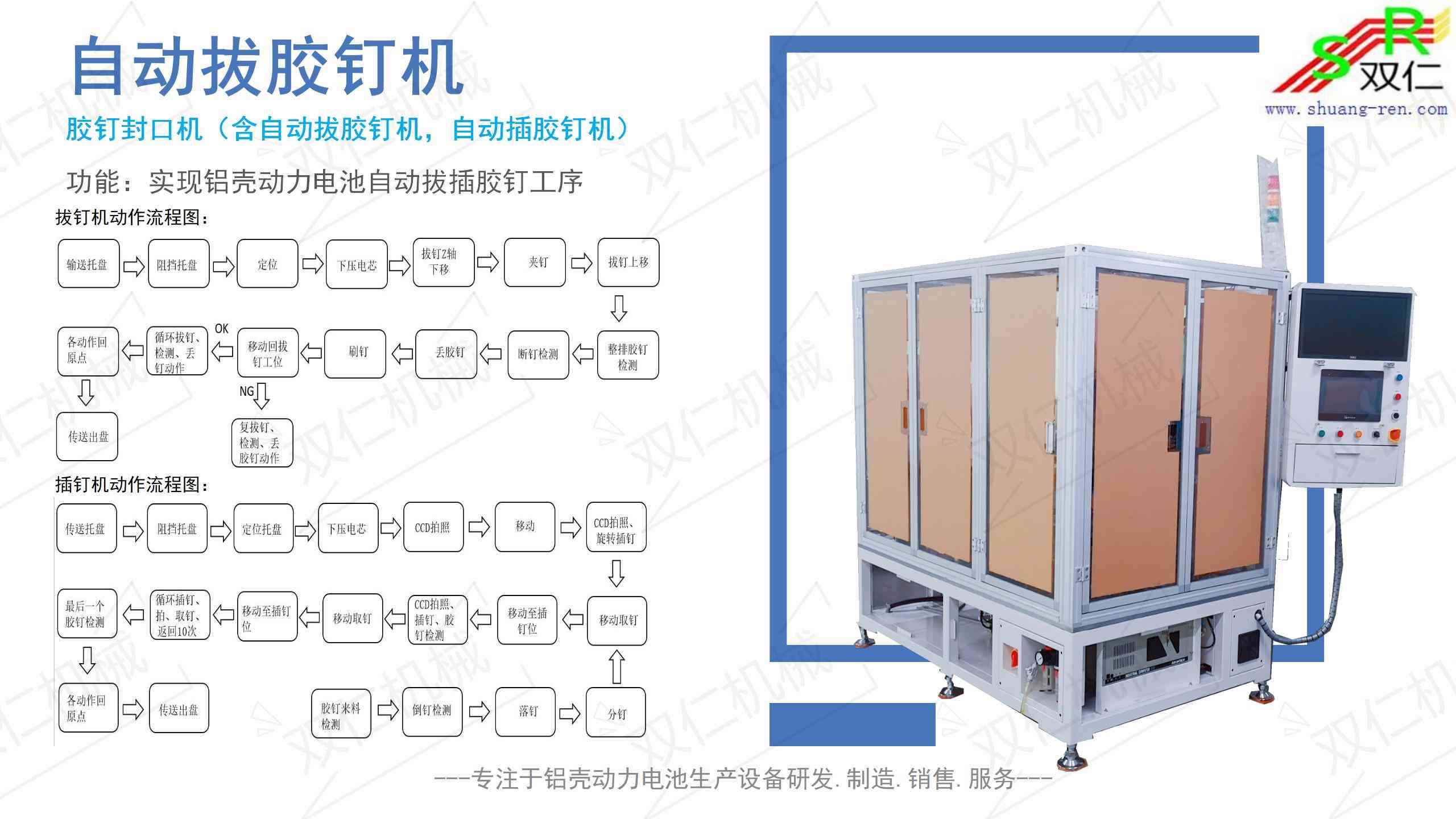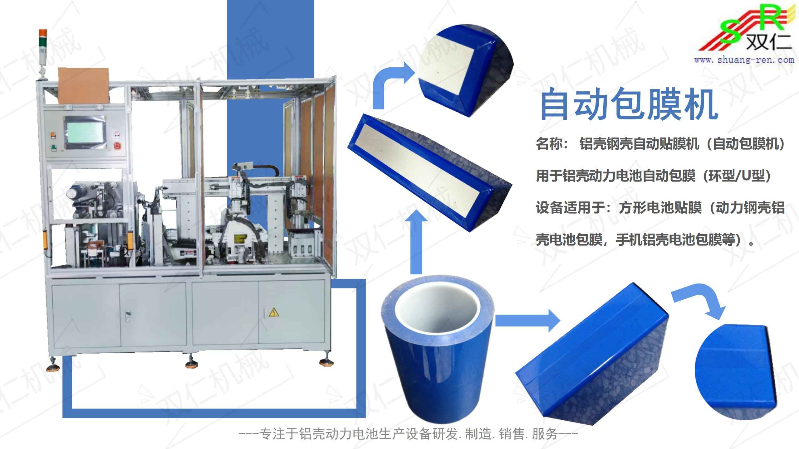 “东莞市双仁机械设备科技有限公司”始创于2010年7月,是一家集研发、制造、服务于一体的专业锂电池自动化生产设备的公司。 拥有方形铝壳动力电池、软包装电池等系列生产设备的研发与制造能力。我们不仅仅制造设备,同时也专注于配合客户对电池生产工艺的改进,协助客户提高产品优率和产能;我们的团队拥有丰富的同行业实战经验,对电池生产工序和生产设备有非常深刻的理解;希望我们的用心服务为您创造更高价值!主要产品有:全自动包膜机贴膜机/全自动钢珠封口机 /全自动换钉线自动拔钉自动塞钉机/全自动胶钉封口机/全自动氦检测漏机/PACK组装线。