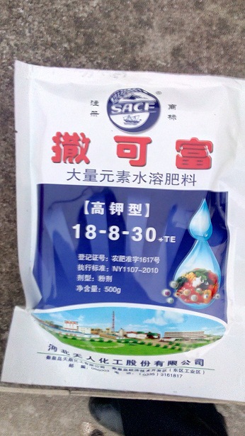 天人、撒可富系列水溶性肥料是速效肥料,可以让用户较快看到肥料的效果和表现。另外施用方法十分简便,它可以随着灌溉水包括喷灌、滴灌等方式进行灌溉时的施肥,既节约了水,又节约了肥料,而且还节约了劳动了。由于施用方法是随水灌溉,所以使得施肥极为均匀,这也为提高产量和品质奠定了坚实的肌醇。