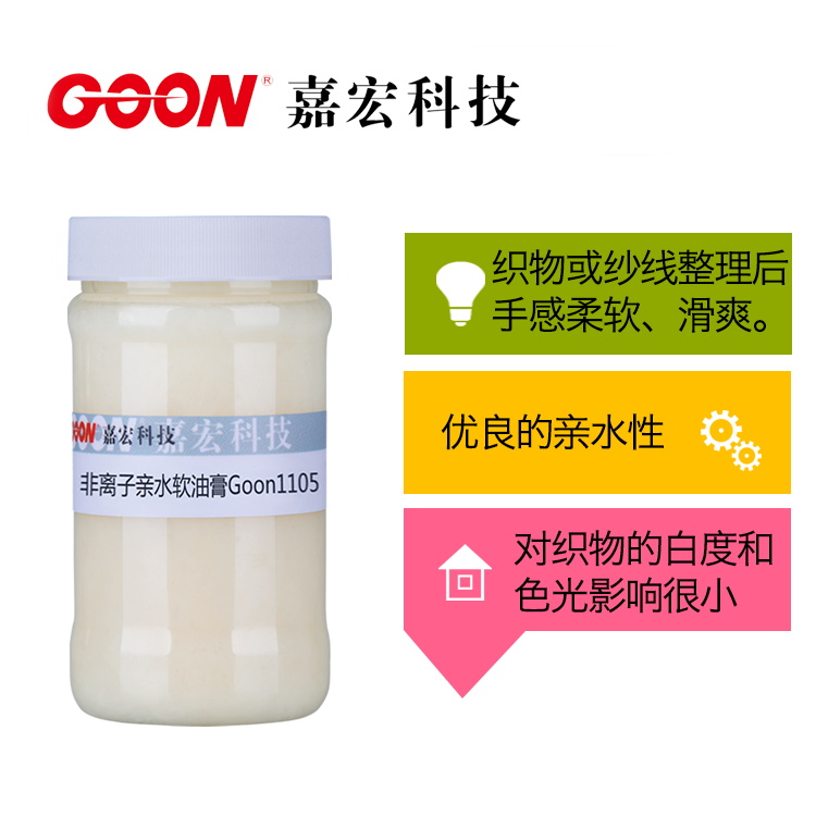 非离子亲水软油膏Goon1105是双脂肪酰胺基乙氧基甲基季铵盐化合物,适用于棉及其混纺产品手感整理,能赋予整理物优良的柔软、干爽、平滑效果和良好的亲水性,是一种新型的柔软剂。