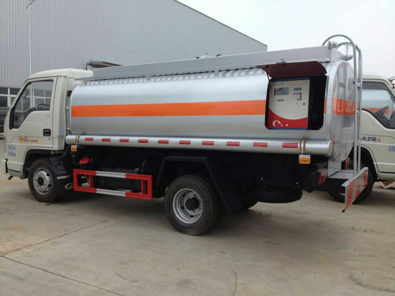 5吨配置:江淮驭铃,江淮五十铃120马力发动机,轴距3300mm,750轮胎,5档变速箱,宽体驾驶室,气刹. 严格按照国家新标准制作,加装前轮盘式制动,ABS,限速,海底阀,欧标罐口,下装口,油气回收,防溢漏探杆,带大流量加油机,电磁歇火,原厂动力转向,空调。