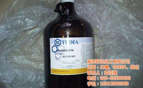 应用于乙腈最主要的用途是作溶剂。在石油工业中用于从石油烃中除去焦油、酚等物质的溶剂。在油脂工业中用作从动植物油中抽提脂肪酸的溶剂,在医1药上用于甾族类药物的再结晶的反应介质。乙腈是医1药(维生素B1),香料的中间体,是制造均三qín氮肥增效剂的原料。也用作酒精的变性剂。此外,还可以用于合成乙胺、乙酸等,并在织物染色、照明工业中也有许多用途。