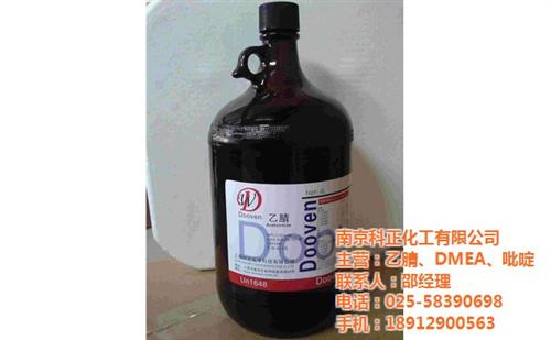 乙腈亦称甲1基腈,分子量41.05,闪点 5.6 ℃,沸点81.6℃,常温常压下为无色液体,相对于水密度0.7768g/cm3(25/4℃)、相对于空气密度 1.4 g/cm3。带芳香气味,但久闻则可致嗅觉疲劳而不易感知其存在。易挥发,溶于水,亦易与乙醇、乙2醚、丙1酮、氯1仿、四氯1化碳、氯乙烯等混溶,水溶液不稳定,可水解为醋酸和氨;乙腈受热则可释出氢qing酸。