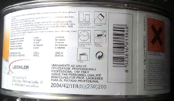 溶剂挥发度(根据欧盟法规DIR2004/42/CE):车壳填充剂/填眼灰 IIB—使用的挥发度为250克/升。