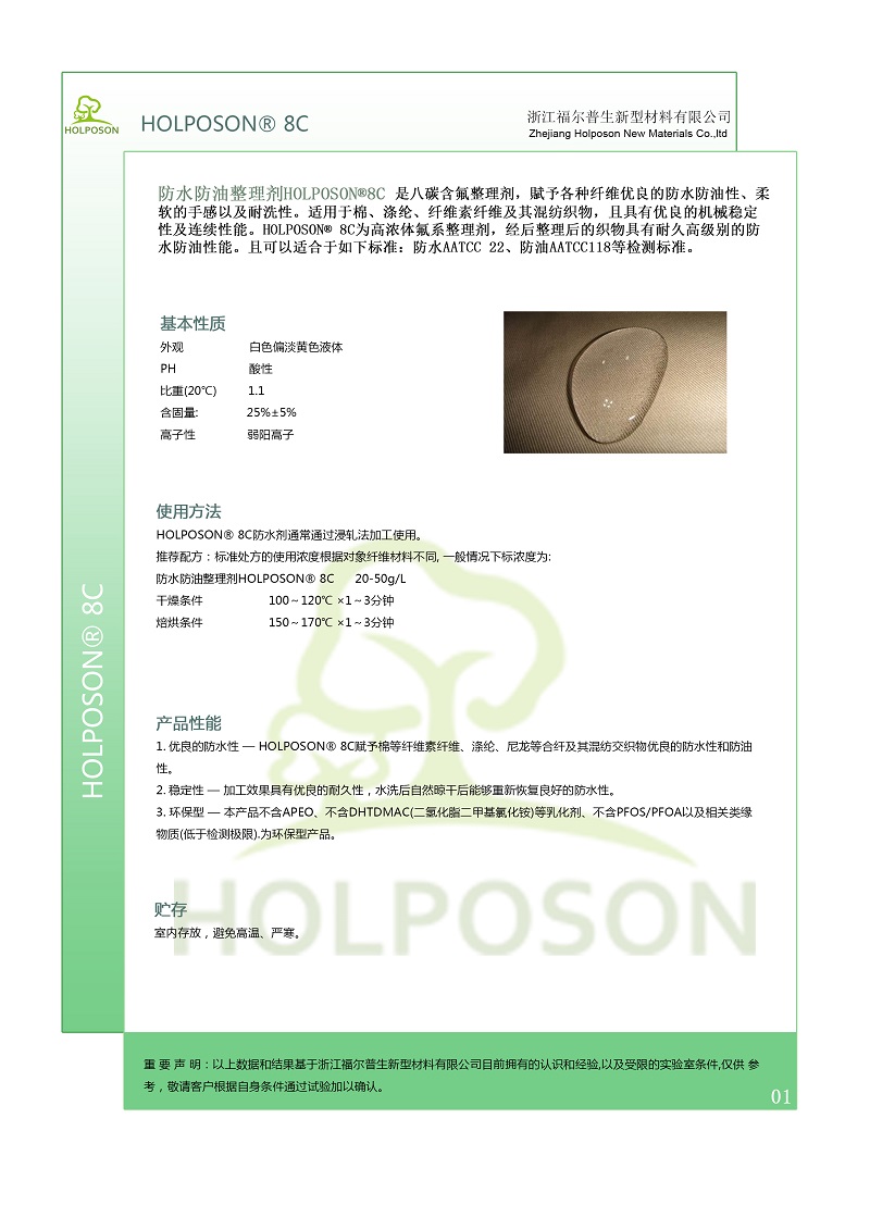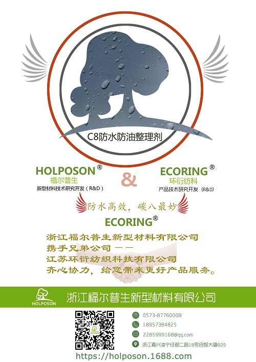 2. HOLPOSON C8-PLUS赋予棉等纤维素纤维、涤纶、尼龙及其混纺织物优良的防水性和防油性;