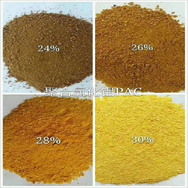 因生产工艺和原材料不同,生产出来的PAC颜色也有些差别,一般有白色、淡黄色、金黄色、褐色、棕色、咖色这六种颜色的聚氯化铝。