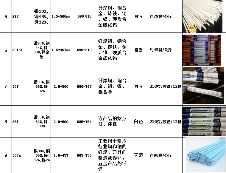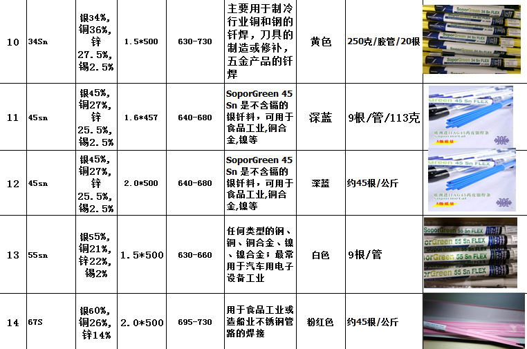 我们生产的药皮银焊条常用的有30%,35%,40%,45%,焊丝直径1.5mm,连药皮直径2.7mm,适用于水龙头,五金,刀具,工具制造行业使用。