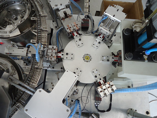 设备功用:振动盘自动供料及组织自动上下料,多工位(上料检查、攻丝加工、攻牙加工…)一起加工,加工质量在线检查,不良及时报警停机,换不一样机种时只需作相应的配件替换即可
