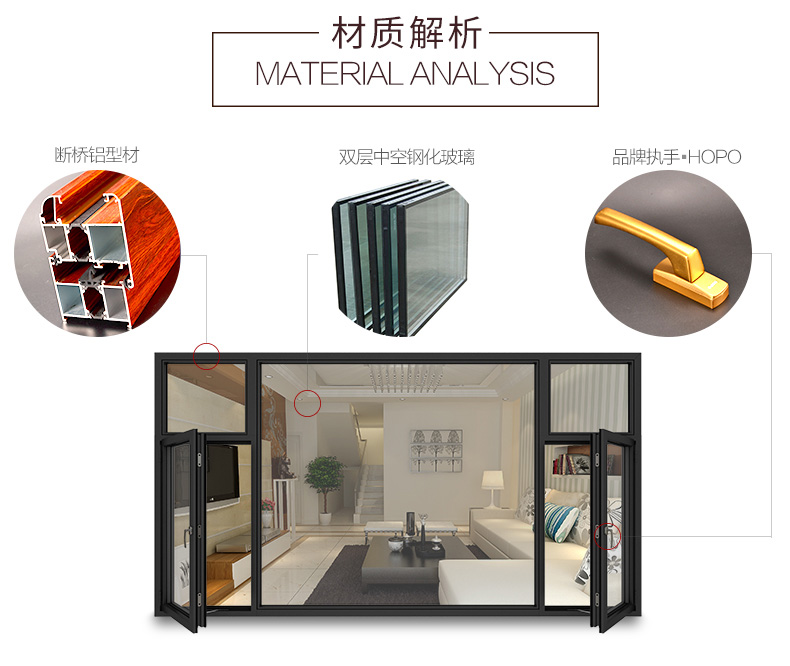 断桥铝合金门窗的原理是利用塑料型材将室内外两层铝合金既隔开又紧密连接成一个整体,构成一种新的隔热型的铝型材,用这种型材做门窗,其隔热性与塑钢窗在同一个等级--国标级,彻底解决了铝合金传导散热快、不符合节能要求的致命问题,同时采取一些新的结构配合形式,彻底解决了“铝合金推拉窗密封不严”的老大难问题。 该产品两面为铝材,中间用塑料型材腔体做断热材料。这种创新结构设计,兼顾了塑料和铝合金两种材料的优势,同时满足装饰效果和门窗强度及耐老性能的多种要求