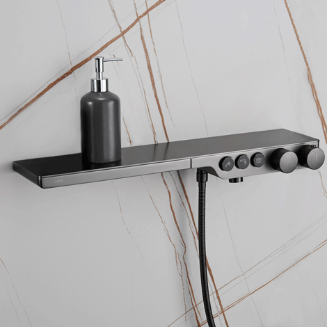 当坚实耐腐的精铜,邂逅严谨的工匠精神,一场精致的工业美术秀,在[PHANTOM歌灵]恒温淋浴花洒,一体化纯铸造方间尽显智美优品。低调静谧的枪黑色让整个产品更高端,它通过淋浴管预埋设计,把一切不必要的东西放在平面之外,只留下最简单的功能模块,完全没有视觉阻碍。主体大平面加入不锈钢板防锈防刮防腐蚀,且可放置多个洗浴品。自带工业感的齿轮式调温 及流量开关,阻尼舒适,操作畅顺,开关阀芯及恒温阀芯都采用德国原装进口普鲁士全铜制阀芯,轻松开启、精准调节、恒定温度安全耐用。而独立按键,标识清晰,易于使用。下出水咀采用原装进口瑞士纽珀层流式起泡器,高流量非起泡,水流水晶般清澈且不起溅,减少水垢,延长使用寿命。底部的机械纹理结构来自于面面俱到的匠心考量,展示出了产品的美感。所搭配的头顶花洒空气注入式,它在提升冲刷力和使用感受的同时兼顾节水目的。而手持花洒采用三种出水模式,无论是激情喷射还是狂野瓢泼,又或是雾雨迷朦,都能放纵您千变万化的心情。[PHANTOM歌灵]兼顾了功能与视觉的高度融合,体现出对奢享质感品质的不懈追求。