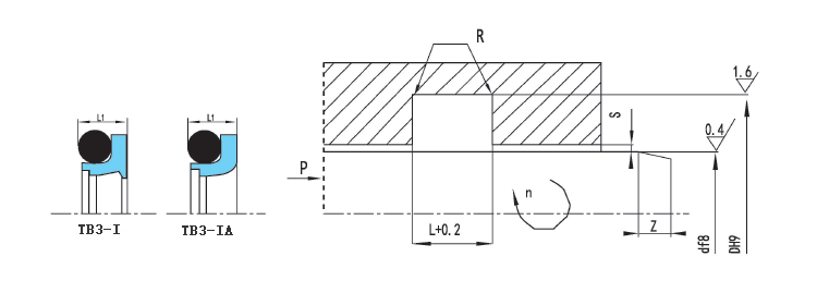 TB3-I旋转轴用滑环式组合密封适用于轴用液压与气动旋转运动密封。系增强聚四氟乙烯PTFE(自主配方)齿形滑环与橡胶O形圈组合而成;适用于液压与气动旋转轴用单向密封,可用于水压密封,分为TB3-I(标准型)和TB3-IA(高速型),TB3-IB特殊的唇口设计即使用于气压往复或旋转密封也具有良好的密封效果和极低的摩擦阻力。