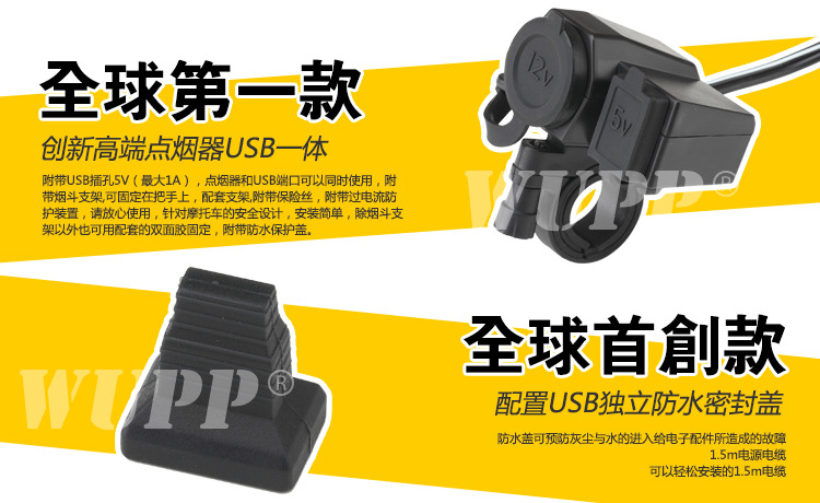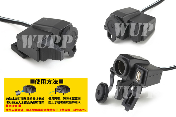 1.防水点烟器插座和UBS车充插座一体机,大功率输出。 3.产品安装独特设计,配龙头固定支架。 4.内置智能微处理芯片和保险丝,防止过流、过载、过压等现象。 |