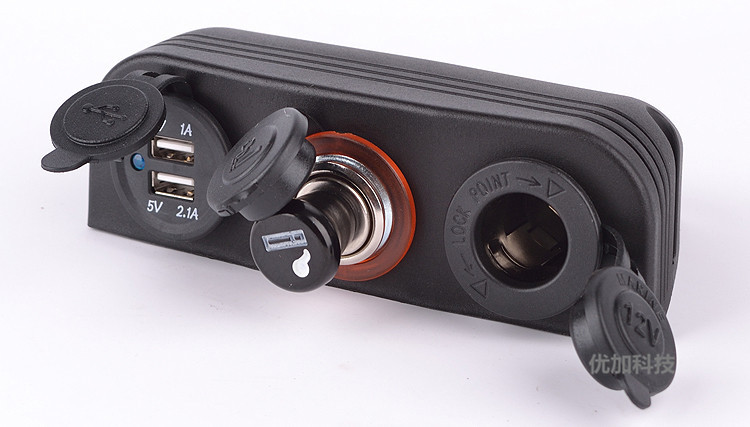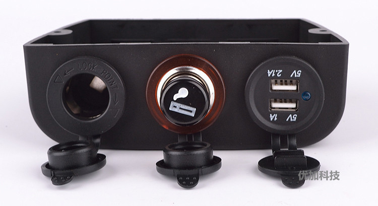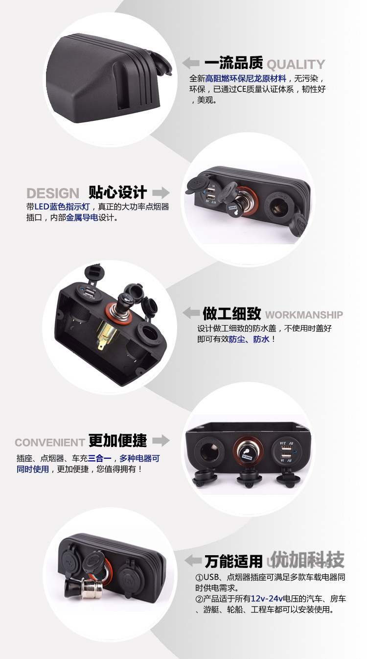 1.双USB插口、点烟器插座可配合USB支持多款电子产品充电。
