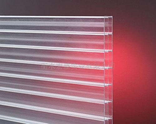 8. 表面有防紫外线的共挤层,可防止太阳光紫外线引起的树脂疲劳变黄。表面共挤层具有化学键吸收紫外线并转化为可见光,对植物光合作用有良好的稳定效果。人工气候老化试验4000小时,黄变度为2,透光率降低值仅0.6%。十年后透光流失仅为6%,PVC流失率则高达15%—20%,玻璃纤维为12%-20%。