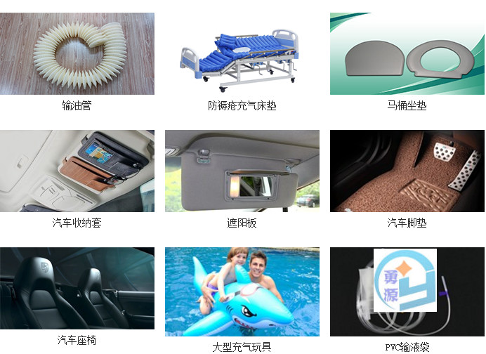 例如: PVC包装袋,雨衣,充气玩具,各类凹凸型的花纹、字母、LOGO等压制,用品(输液袋、尿袋、引流袋等),鞋服箱包压花,识别带,PVC线束、充气枕,卡套,胸卡,书皮、软膜天花、电热水袋、水囊、沼气袋、快速门、帐篷、膜结构、车篷等。