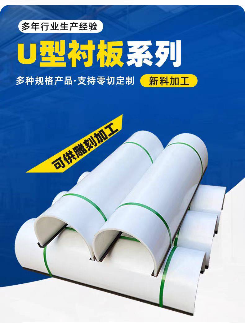 密度仅为钢材的1/8,重量轻,单块U型衬板可轻松搬运、定位。作为预制成型的标准件或定制件,可快速放入或扣合在金属槽体内,支持螺栓固定或嵌扣式安装,安装效率远高于多块平板的拼接与焊接。安装后无需涂刷防腐漆或润滑油,实现真正的免维护运行。