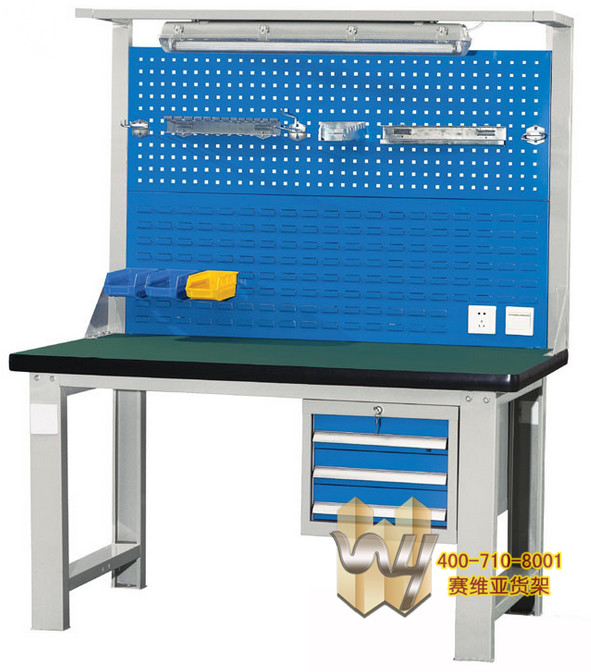 工作台适合于模具、钳工、检测、维修、组装等各种不同应用场合,具有良好的耐腐蚀性,耐脏性,抗冲击性和承重能力强。桌面经特殊处理,具有防腐、抗冲击力强等特点,多种桌面的选择,可配合不同的使用要求;所配置的抽屉、柜门方便使用者存储工具;桌角上预留电源孔,方便安装电源插座。
